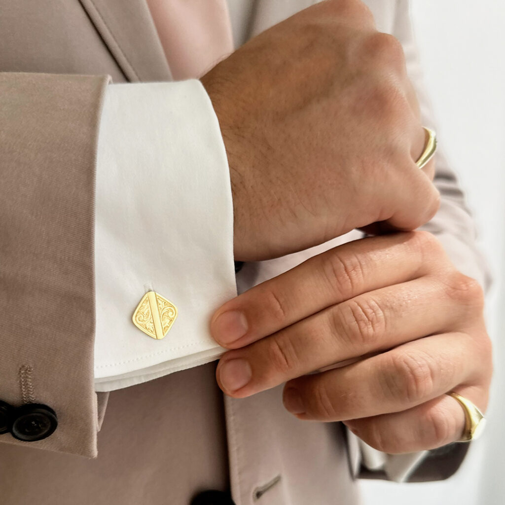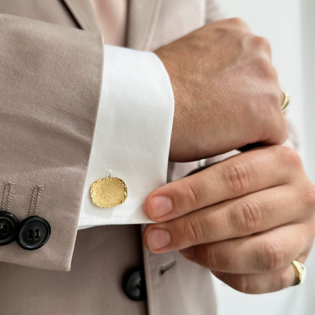 Neben klassischen Modellen bieten wir auch maßgefertigte Manschettenknöpfe an, die nach persönlichen Vorstellungen gestaltet werden. Gravuren mit Monogrammen, Initialen oder einem Familienwappen machen jedes Paar einzigartig. Auf Wunsch können auch kleine Diamanten oder Farbsteine eingefasst werden, um ein dezentes, aber edles Detail zu setzen. Diese individuellen Manschettenknöpfe entstehen in enger Zusammenarbeit mit unserem Goldschmied und werden nach Terminvereinbarung persönlich besprochen. So entsteht ein Schmuckstück, das nicht nur getragen, sondern auch weitergegeben werden kann.