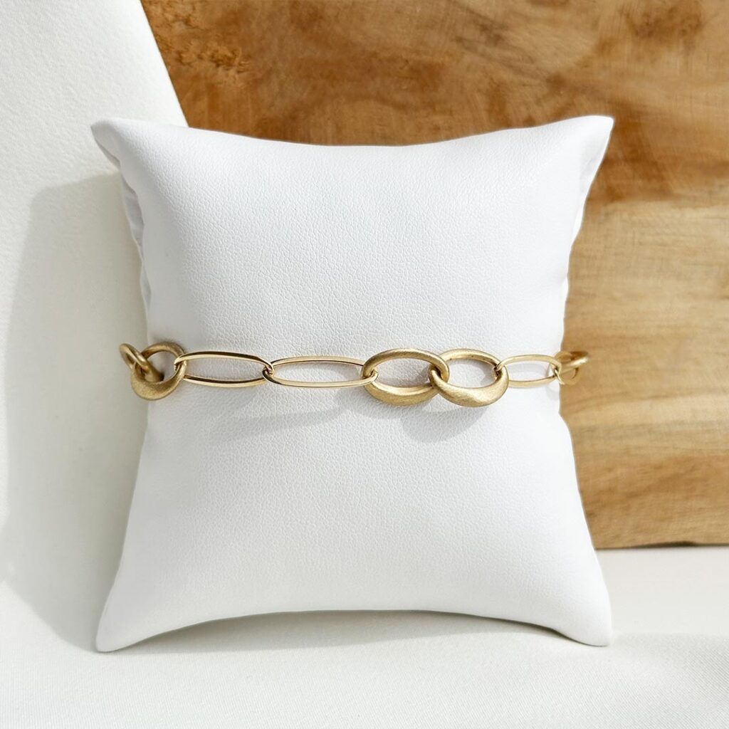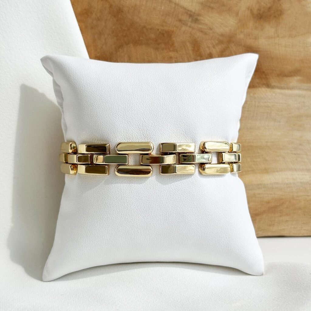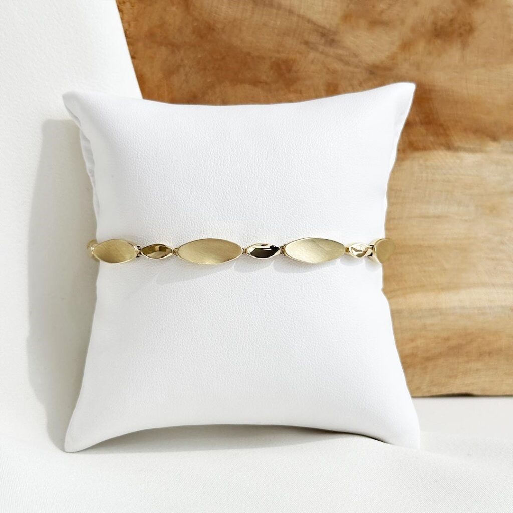Armband aus 585er Gelb- und Weißgold mit 8mm breiten, sanft geschwungenen Gliedern und durchbrochener Struktur, 19cm lang, elegant in Nahaufnahme dargestellt.