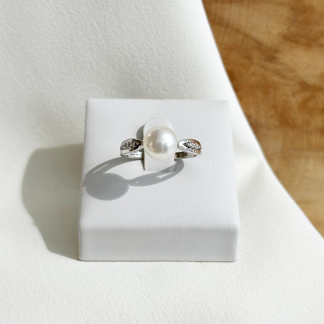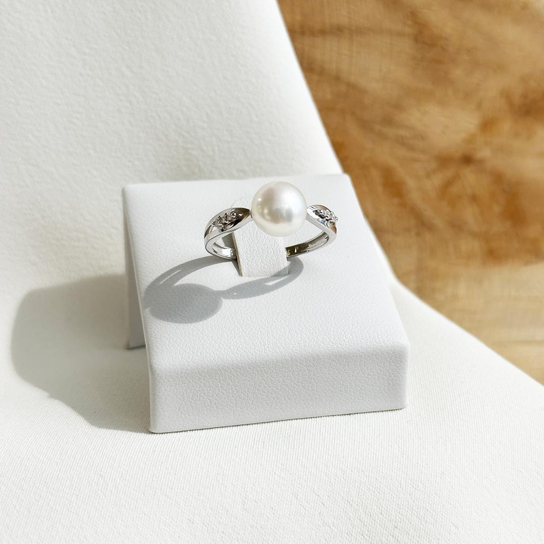 Dieser Perlenring aus 585er Weißgold verbindet klassische Zurückhaltung mit feiner Raffinesse. Im Zentrum steht eine weiße Süßwasserperle, deren zarter Schimmer stilvoll von kleinen Brillanten begleitet wird. Die Steine sind seitlich in die Ringschiene eingefasst und sorgen für ein feines Funkeln, ohne sich in den Vordergrund zu drängen. Die Kombination aus kühlem Weißgold und edler Perle wirkt ausgewogen und elegant – ein Schmuckstück für alle, die schlichte Formen und hochwertige Materialien schätzen. Ein stilvoller Ring, der sowohl im Alltag als auch zu festlichen Anlässen überzeugt. Lagernd in der Weite 55.