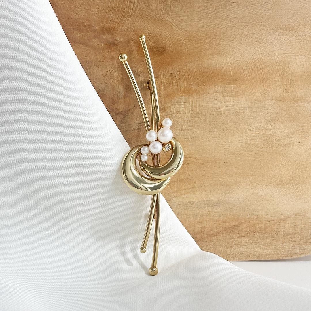 Diese Stabbrosche aus 585er Gelbgold beeindruckt durch ihr sanft geschwungenes Design und eine feine Kombination aus Perlenbesatz und Diamantakzent. Die zarten Perlen harmonieren mit dem warmen Goldton und unterstreichen die elegante Linienführung der Brosche. Ein kleiner, funkelnder Diamant verleiht dem Schmuckstück zusätzlich eine besondere Note. Durch ihre geschmeidige Form wirkt die Brosche weich und edel zugleich – ein stilvolles Accessoire, das sowohl zu festlichen als auch zu schlichten Outfits getragen werden kann. Ein zeitloses Stück für Liebhaberinnen klassischer Eleganz.