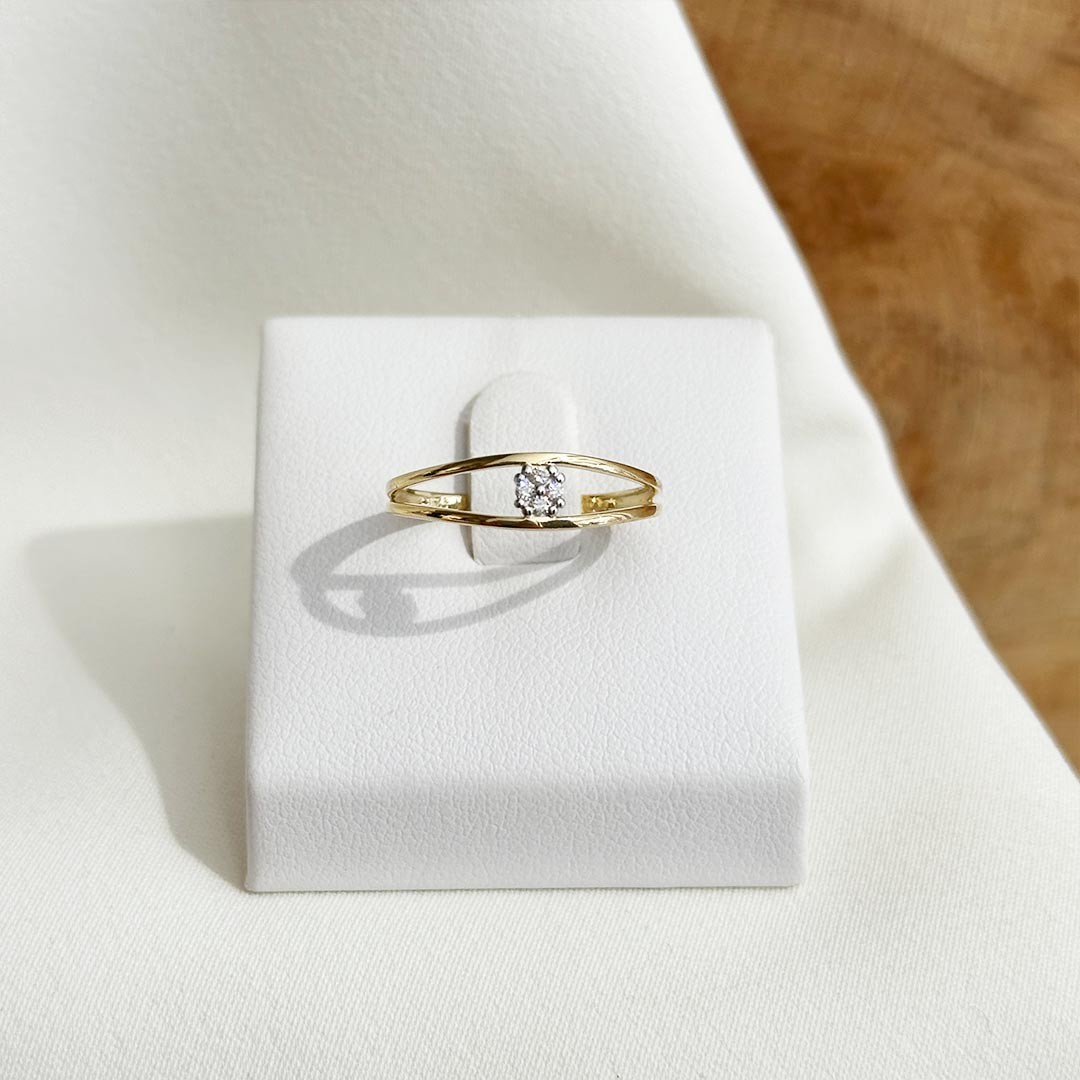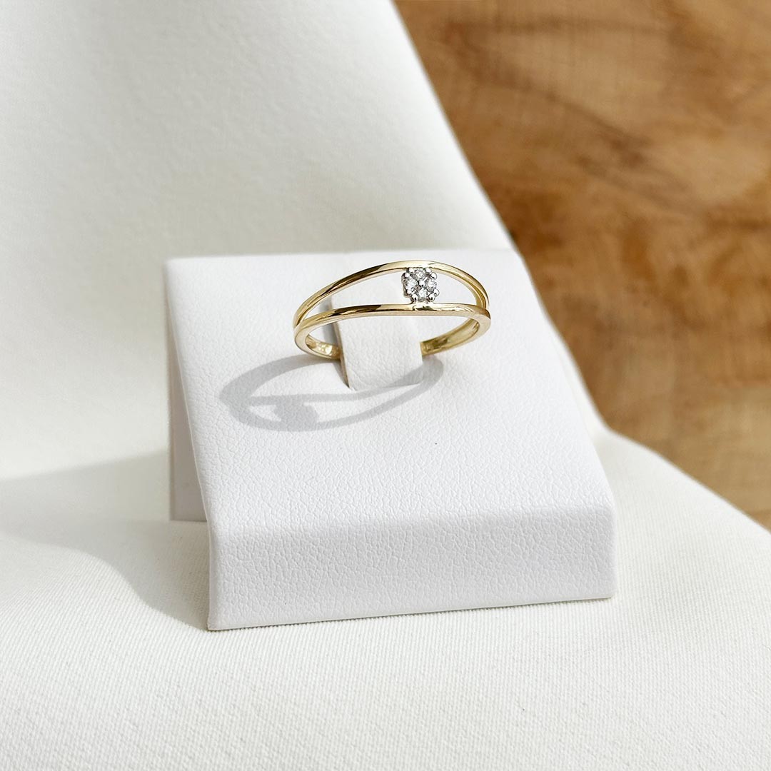 Dieser moderne Diamantring aus 585er Gelbgold verbindet raffinierte Gestaltung mit angenehmem Tragekomfort. Die Ringschiene teilt sich seitlich und öffnet sich zu einem luftig-leichten Design, das durch seine klare Linienführung dennoch präsent wirkt. In der Mitte sitzen vier kleine, präzise gefasste Diamanten, eingefasst in Weißgold – so kunstvoll arrangiert, dass sie wie ein einzelner, größerer Stein erscheinen. Das flache Design sorgt dafür, dass der Ring sich sanft an den Finger schmiegt und im Alltag kaum spürbar ist. Ein feines Schmuckstück mit moderner Leichtigkeit und subtiler Brillanz.