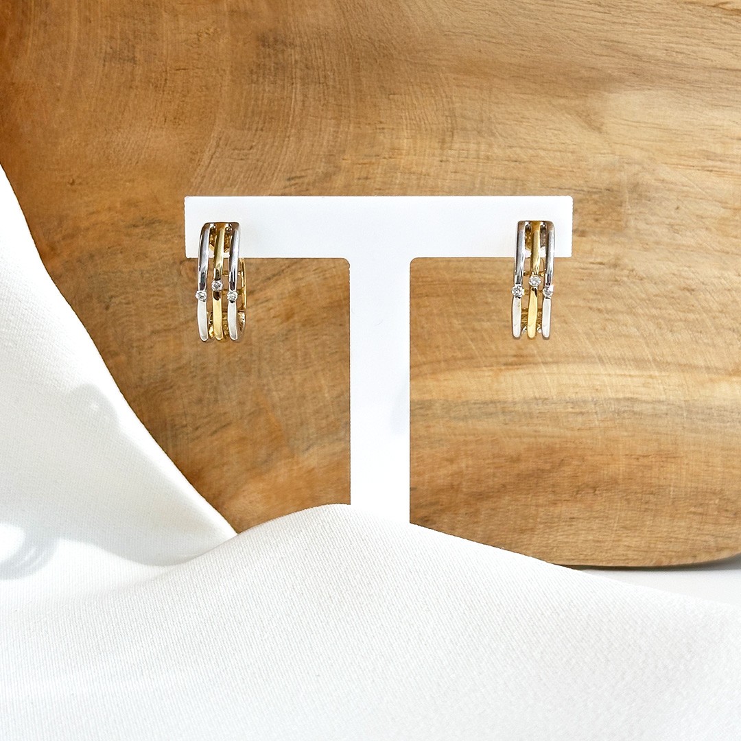 Diese Creolen aus 585er Weiß- und Gelbgold verbinden elegante Gestaltung mit angenehmer Leichtigkeit. Mit einem Durchmesser von 17mm und einer Breite von 4mm wirken sie durch ihre flächige Form präsent, bleiben aber durch die feine Verarbeitung angenehm zu tragen. Vorne in der Mitte jeder Creole sind drei kleine Diamanten eingefasst, die dem Ohrschmuck ein dezentes Funkeln verleihen. Die Kombination aus warmem Gelbgold und kühlem Weißgold sorgt für ein lebendiges Erscheinungsbild und macht die Creolen vielseitig kombinierbar – ob zu weiterem Halsschmuck oder Ringen in beiden Goldfarben. Ein stilvoller Begleiter, der Alltagstauglichkeit mit eleganter Ausstrahlung verbindet.