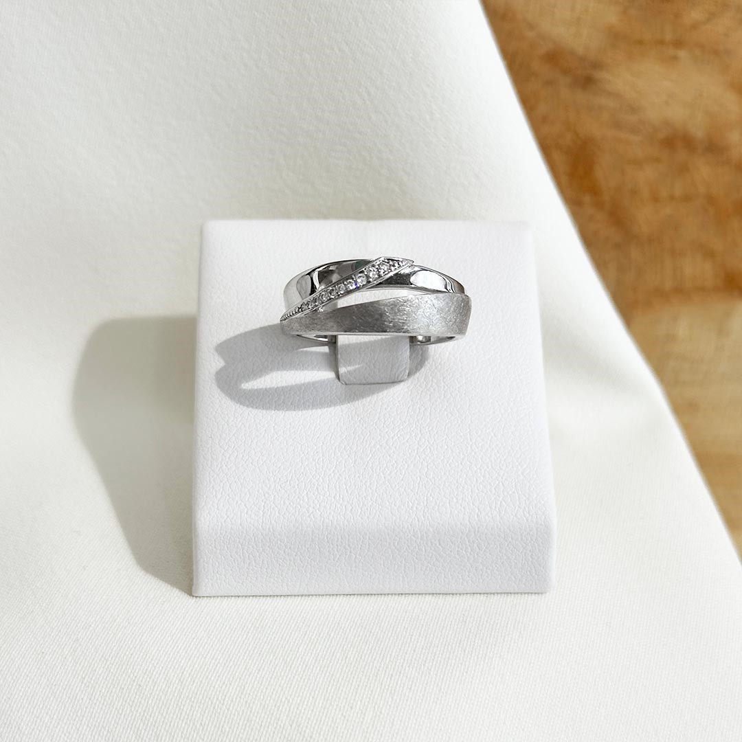 Dieser Ring aus 585 Weißgold überzeugt durch seine besondere Gestaltung und feine Verarbeitung. Die Kombination aus polierter und eismattierter Oberfläche verleiht dem Schmuckstück eine charaktervolle Optik mit spannenden Kontrasten. Eine schräg verlaufende Linie aus Brillanten setzt ein edles Highlight und verbindet die beiden Oberflächen harmonisch miteinander. Die dezente Ausnehmung in der Mitte verleiht dem Ring eine moderne Leichtigkeit – ein stilvoller Begleiter für alle, die klare Formen und ein ausdrucksstarkes Design schätzen.