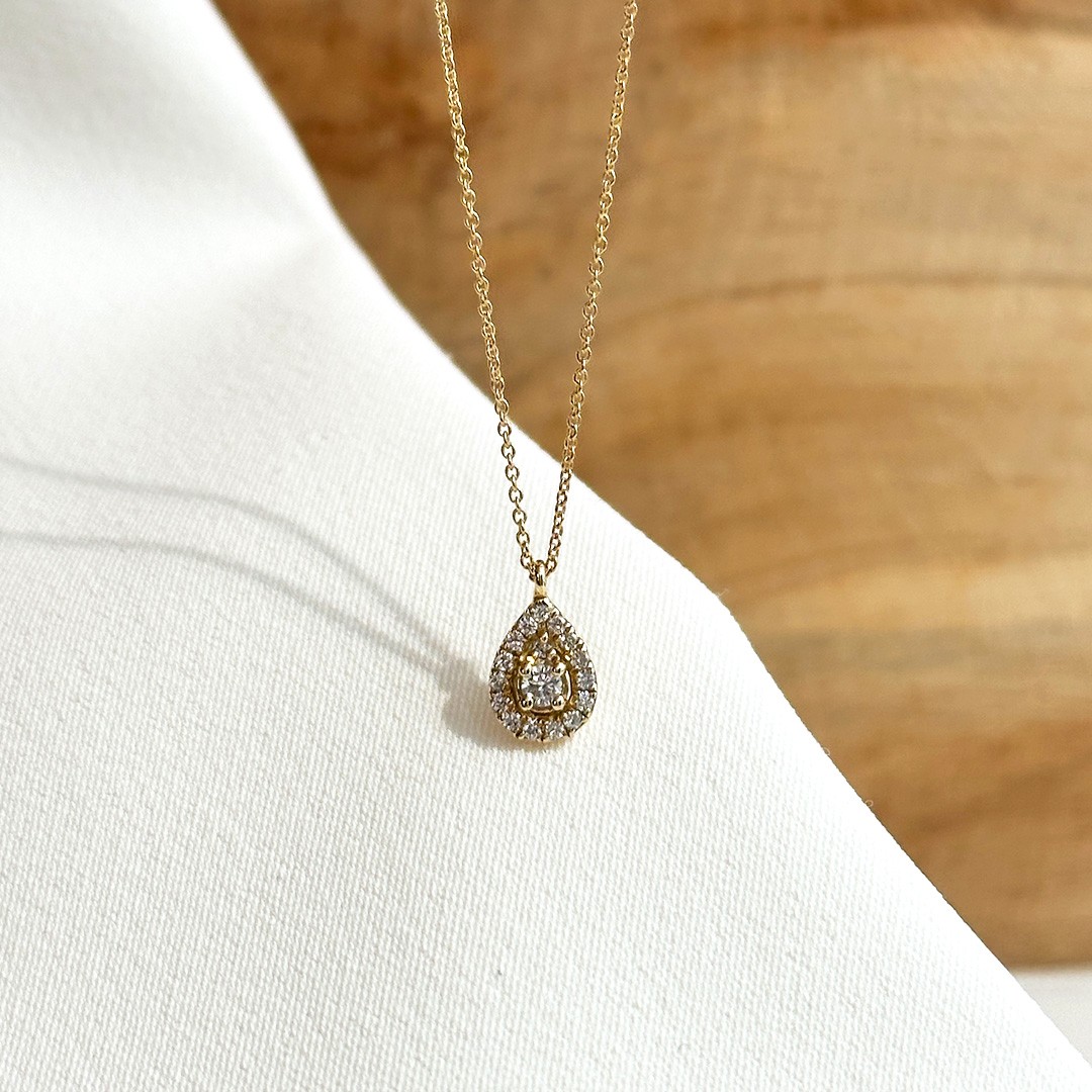Dieses zarte Diamant-Collier aus 585er Gelbgold besticht durch seinen feinen Anhänger in Tropfenform, der mit mehreren funkelnden Diamanten besetzt ist. Im Zentrum strahlt ein etwas größerer Stein, der von kleineren, dicht aneinandergesetzten Diamanten umgeben wird, sodass die Tropfenform elegant ausgefüllt und das Licht aus jeder Richtung eingefangen wird. Mit seiner Größe von 10mm wirkt der Anhänger dezent und dennoch ausdrucksvoll – ein Schmuckstück, das durch seine feine Gestaltung besonders entzückt. Die Kette selbst ist 45cm lang und verfügt über eine Zwischenöse bei 42cm, wodurch sie flexibel kürzer getragen werden kann. Dieses Collier eignet sich wunderbar als erstes Diamantschmuckstück, sei es zur Firmung, Matura, zum Geburtstag oder einem anderen besonderen Anlass. Ebenso ist es eine liebevolle Wahl als Geschenk zur Morgengabe. Ein feines Schmuckstück, das durch Eleganz und Symbolkraft überzeugt und viele Gelegenheiten verschönert.