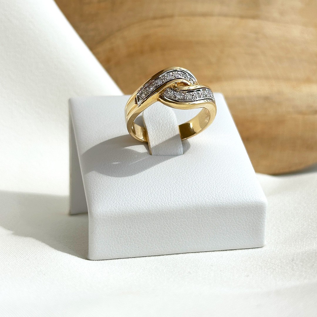 Dieser Ring aus 585er Gelb- und Weißgold überzeugt durch seine harmonisch geschwungene Form, die von beiden Seiten sanft zur Mitte hin verläuft und ihm eine flächige, elegante Wirkung verleiht. In den Weißgold-Elementen, die wie feine Rahmen gearbeitet sind, sind jeweils sieben Brillanten präzise eingefasst. Durch die raffinierte Anordnung entsteht der Eindruck einer größeren Brillanzfläche, die den Ring besonders strahlen lässt. Die Kombination aus warmem Gelbgold und kühlem Weißgold verleiht dem Schmuckstück eine moderne Note und macht es zugleich vielseitig kombinierbar mit anderem Schmuck in beiden Goldfarben. Elegant und zeitlos, dabei doch modern gestaltet, ist dieser Ring ein edler Begleiter für viele Gelegenheiten.