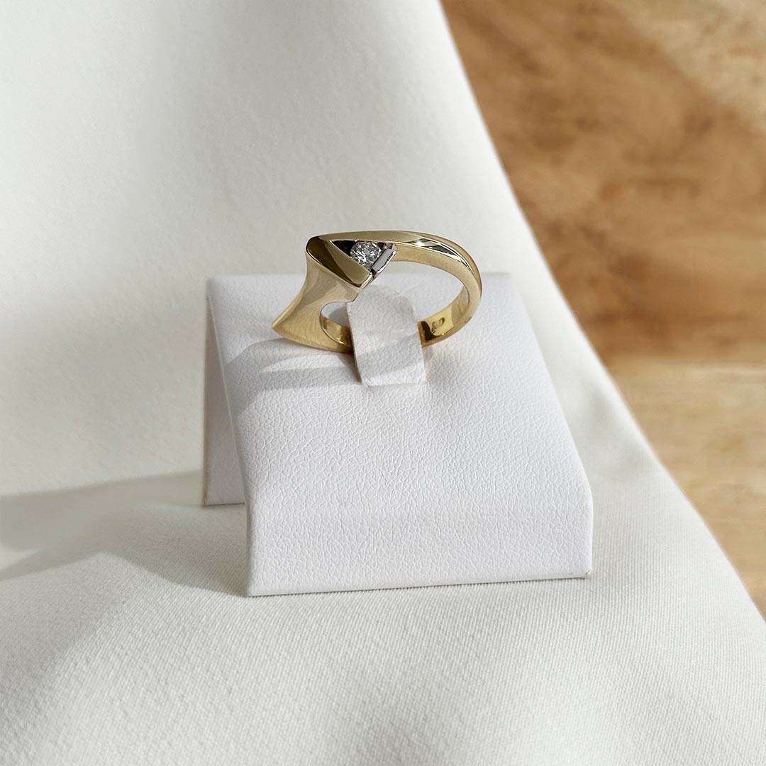 Dieser Ring aus 585 Gelb- und Weißgold besticht durch sein modernes, asymmetrisches Design. Die Form ist nicht klassisch rund, sondern seitlich sanft geschwungen und geradlinig gearbeitet – das verleiht dem Ring eine markante, besondere Ausstrahlung. Ein Brillant mit 0,17ct. bildet den funkelnden Mittelpunkt und wird von der spannenden Linienführung harmonisch eingefasst. Trotz seiner auffälligen Form trägt sich der Ring sehr angenehm und passt sich der natürlichen Form des Fingers wunderbar an. Ein stilvolles Schmuckstück für alle, die Wert auf besondere Details legen. Der Ring ist in der Weite 55 erhältlich.