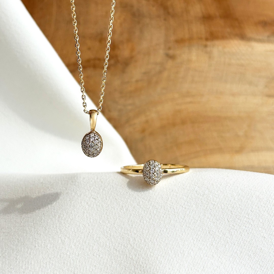 Dieser Anhänger aus 585er Gelbgold besticht durch seine feine, ovale Form, die dezent erhaben gearbeitet ist und so eine elegante Präsenz erhält. Im Zentrum sind zahlreiche kleine Brillanten dicht aneinandergesetzt und ergeben zusammen 0,17ct. Durch diese raffinierte Anordnung entsteht der Eindruck einer größeren Brillanzfläche, die intensiv funkelt und dem Anhänger eine besondere Strahlkraft verleiht. Trotz seiner zarten Größe wirkt er dadurch ausgesprochen edel und lebendig. Getragen an einer feinen Goldkette entfaltet er seine elegante Wirkung und ist ein vielseitiger Begleiter – für den Alltag ebenso wie für besondere Anlässe.