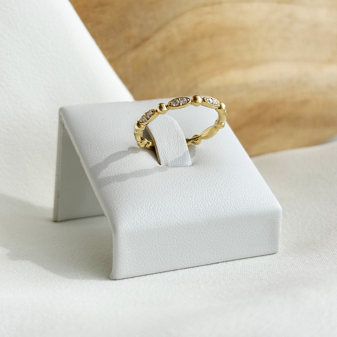 Dieser Diamantring aus 750er Gelbgold zeigt ein verspieltes, lebendiges Design und wirkt dennoch fein und elegant. Entlang der Ringschiene wechseln sich kleine Kugeln mit zarten Fassungen ab, in denen jeweils zwei Brillanten gefasst sind. Diese wiederkehrende Gestaltung verleiht dem Ring eine besondere Leichtigkeit und ein schönes Funkeln bei jeder Bewegung. Bis auf einen kleinen Bereich an der Unterseite ist das Design rundum ausgearbeitet. Dieser bewusst freigelassene Abschnitt ermöglicht eine spätere Weitenänderung des Rings. Mit einer Breite von 2,4mm wirkt der Ring schlank und angenehm zu tragen. Durch seine feine Gestaltung lässt er sich wunderbar mit anderen Ringen kombinieren, etwa mit einem Ehering oder einem Solitärring, kann aber ebenso gut für sich allein getragen werden. Ein zarter Brillantring mit charmantem Charakter. Der Ring ist in der Ringweite 53 lagernd.