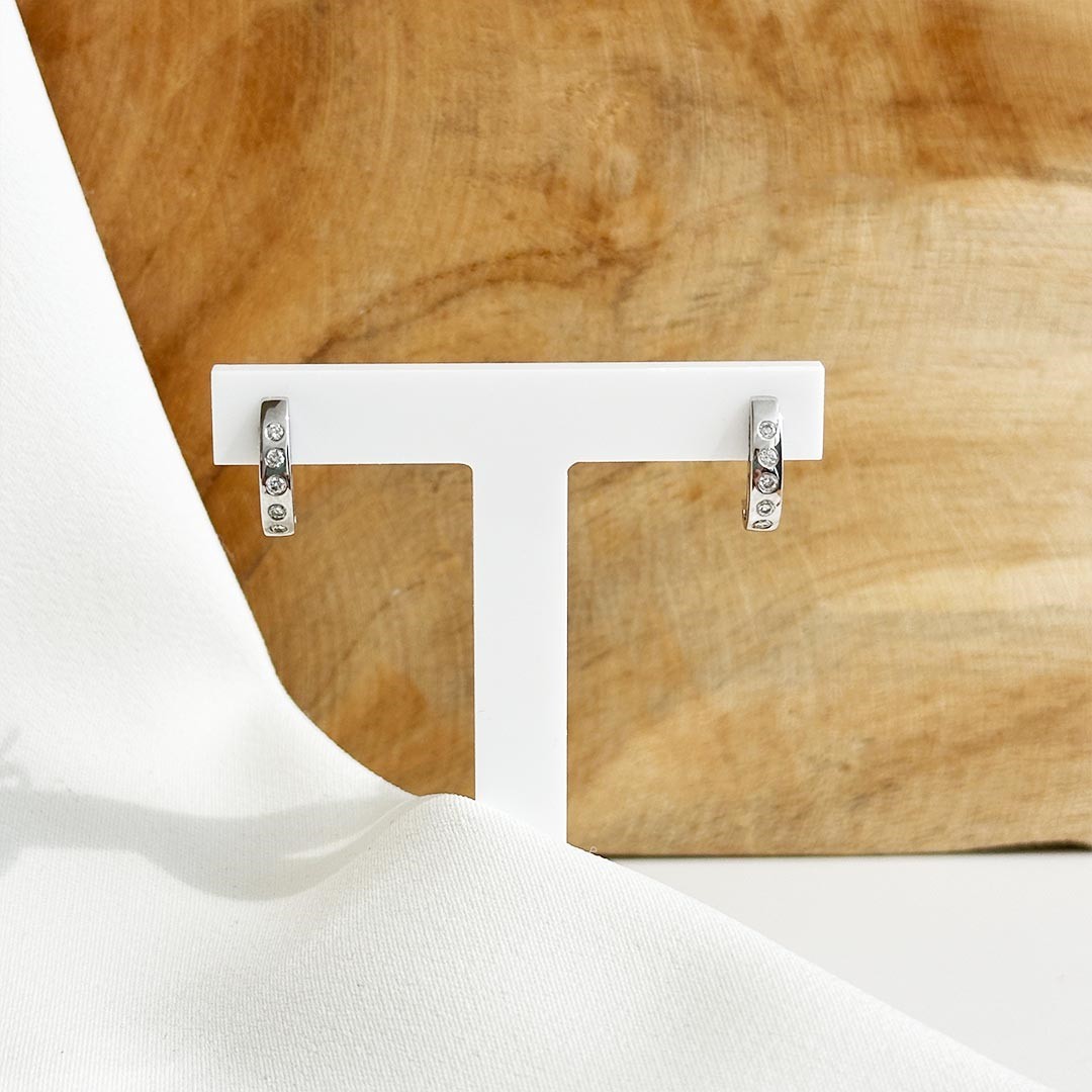 Diese Ohrstecker aus 585er Weißgold wurden in sorgfältiger Handarbeit gefertigt und erinnern in ihrer Silhouette an eine schlichte, moderne Creole. Jeder Stecker ist mit fünf fein gefassten Brillanten besetzt, die in zurückhaltender Eleganz funkeln und dem Design eine edle Note verleihen. Trotz ihrer kompakten Form strahlen die Ohrstecker eine dezente Präsenz aus – ideal für den Alltag und zugleich passend für besondere Anlässe. Die kühle Klarheit des Weißgolds betont die reduzierte Formensprache, während die polierte Oberfläche dem Schmuckstück einen dezenten Glanz verleiht. Ein vielseitig kombinierbares Accessoire für Liebhaberinnen stilvoller Zurückhaltung.