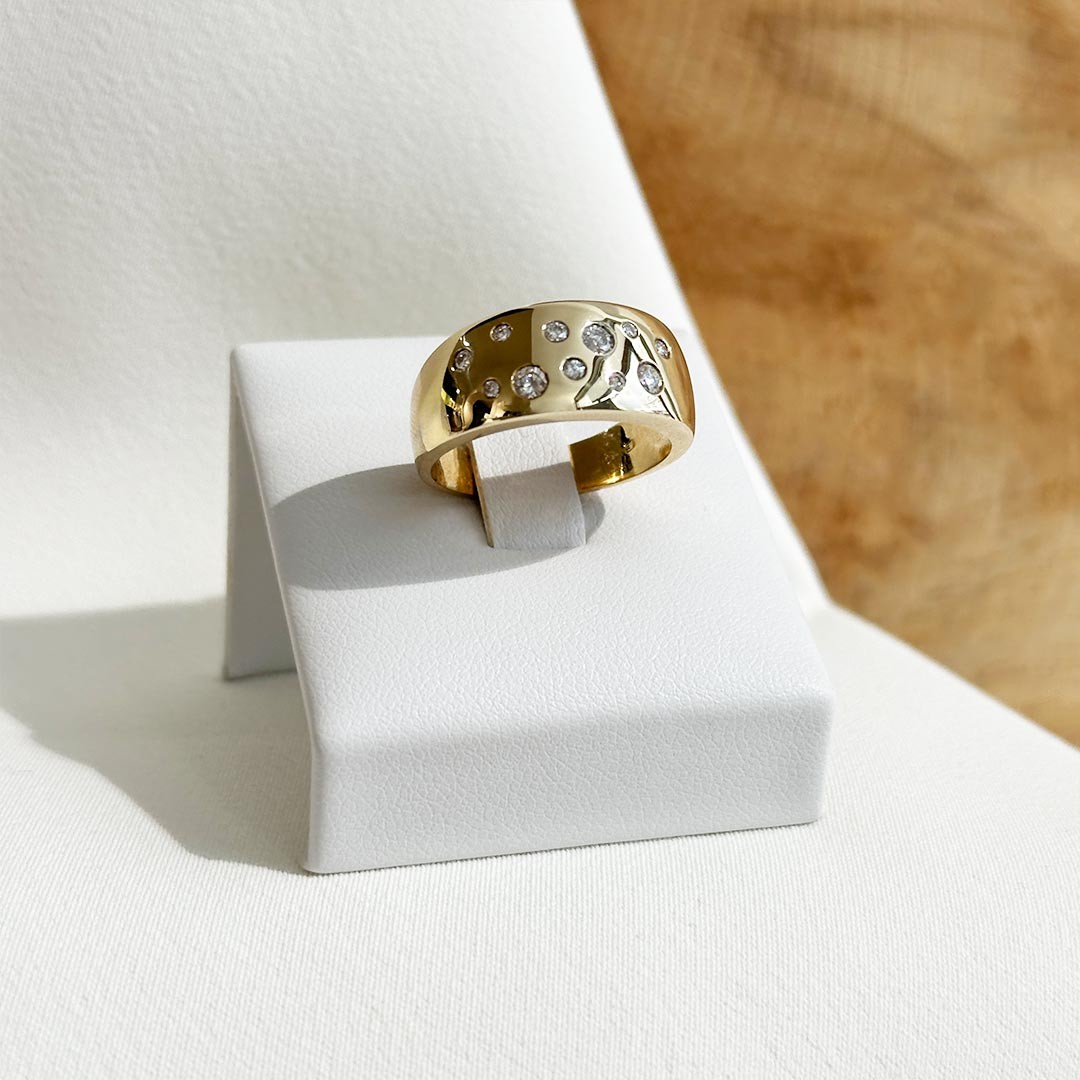 Dieser Ring aus 585 Gelbgold besticht durch sein modernes, ausdrucksstarkes Design. Mit einer Breite von 8mm an der Oberseite bietet er Platz für elf funkelnde Brillanten, die in unterschiedlichen Größen und wie zufällig verteilt eingefasst sind – fast wie kleine Lichtpunkte, die sich über die glänzende Oberfläche verteilen. Die polierte Oberfläche verstärkt den strahlenden Effekt der Diamanten und macht den Ring zu einem echten Blickfang. Trotz seines markanten Designs liegt er angenehm am Finger und lässt sich vielseitig kombinieren. Der Ring ist in der Weite 56 lagernd und ideal für alle, die ein besonderes Schmuckstück mit Charakter suchen.