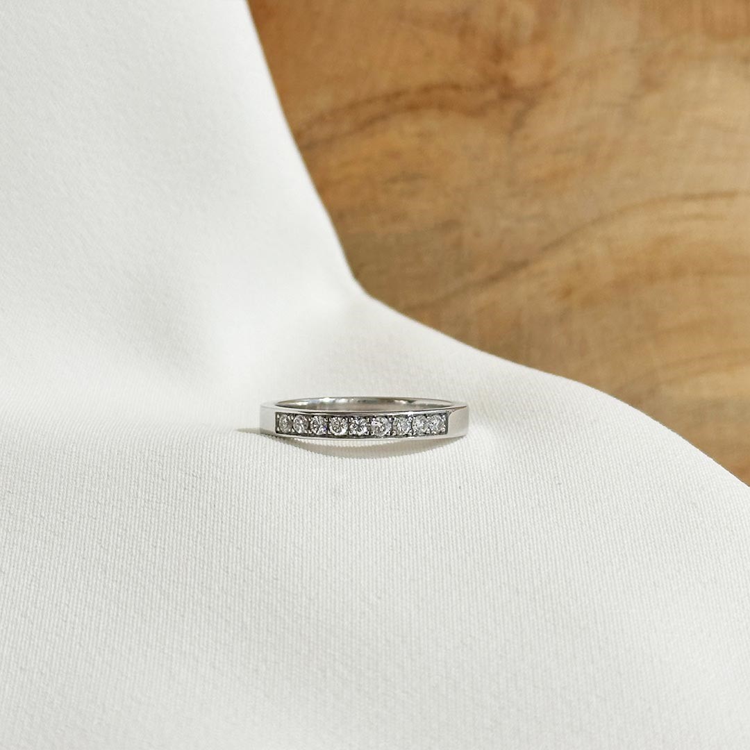 Dieser Diamantring aus 585 Weißgold ist mit neun funkelnden Brillanten besetzt, die in einer Reihe nebeneinander eingefasst sind. Die gleichmäßige Anordnung der Steine verleiht dem Ring eine harmonische Ausstrahlung und macht ihn zu einem eleganten Begleiter für jeden Tag. Ob als schlichter Ehering, als bedeutungsvolles Geschenk oder einfach als stilvolles Schmuckstück – dieser Ring passt immer und unterstreicht jede Schmucksammlung mit zeitloser Eleganz. Der Glanz der Brillanten und das kühle Weißgold ergeben eine klassische Kombination, die nie aus der Mode kommt und jeden Moment veredelt. Der Ring ist in der Weite 55 lagernd.