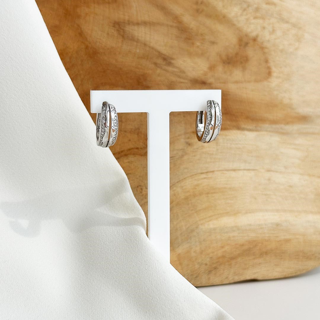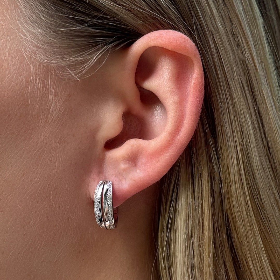 Diese eleganten Creolen aus 585er Weißgold vereinen klassisches Design mit funkelnden Details. Zwei Reihen fein gefasster Diamanten verleihen den sonst schlicht gehaltenen Ohrringen eine besondere Brillanz und machen sie zu einem stilvollen Blickfang. Mit einem Durchmesser von 16 mm und einer Breite von ca. 6,3 mm haben sie eine angenehme Größe – präsent, aber dennoch alltagstauglich. Die hochwertige Verarbeitung und das edle Zusammenspiel von kühlem Weißgold und dem Glanz der Diamanten machen diese Creolen zu einem vielseitigen Begleiter, der sowohl im Alltag als auch zu festlichen Anlässen für einen Hauch von Eleganz sorgt. Ein zeitlos schönes Schmuckstück.