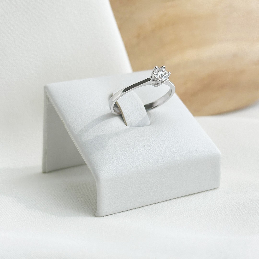 Dieser Solitär Verlobungsring aus 585er Weißgold steht für klassische Eleganz und eine klare, zeitlose Formensprache. Im Mittelpunkt strahlt ein 0,30ct. Brillant, gefasst in einer klassischen 6-Krappenfassung, die dem Stein ermöglicht, besonders viel Licht einzufangen und seine Brillanz voll zu entfalten. Die Ringschiene verjüngt sich sanft zum Diamanten hin und wird zum Stein hin schmäler, wodurch der Fokus bewusst auf das funkelnde Zentrum gelenkt wird. Obwohl die Schiene eher gerade gehalten ist, wirkt sie durch ihre weich abgerundete Verarbeitung äußerst schmeichelnd und angenehm am Finger. Der Ring ist so gestaltet, dass er sich später harmonisch mit einem Ehering kombinieren lässt und damit ein bleibender Begleiter Ihrer gemeinsamen Geschichte wird. Ein stilvoller Verlobungsring für den besonderen Moment der Frage aller Fragen. Der Ring ist in der Weite 54 bei uns im Geschäft lagernd, eine Anpassung der Ringweite ist selbstverständlich gerne möglich.