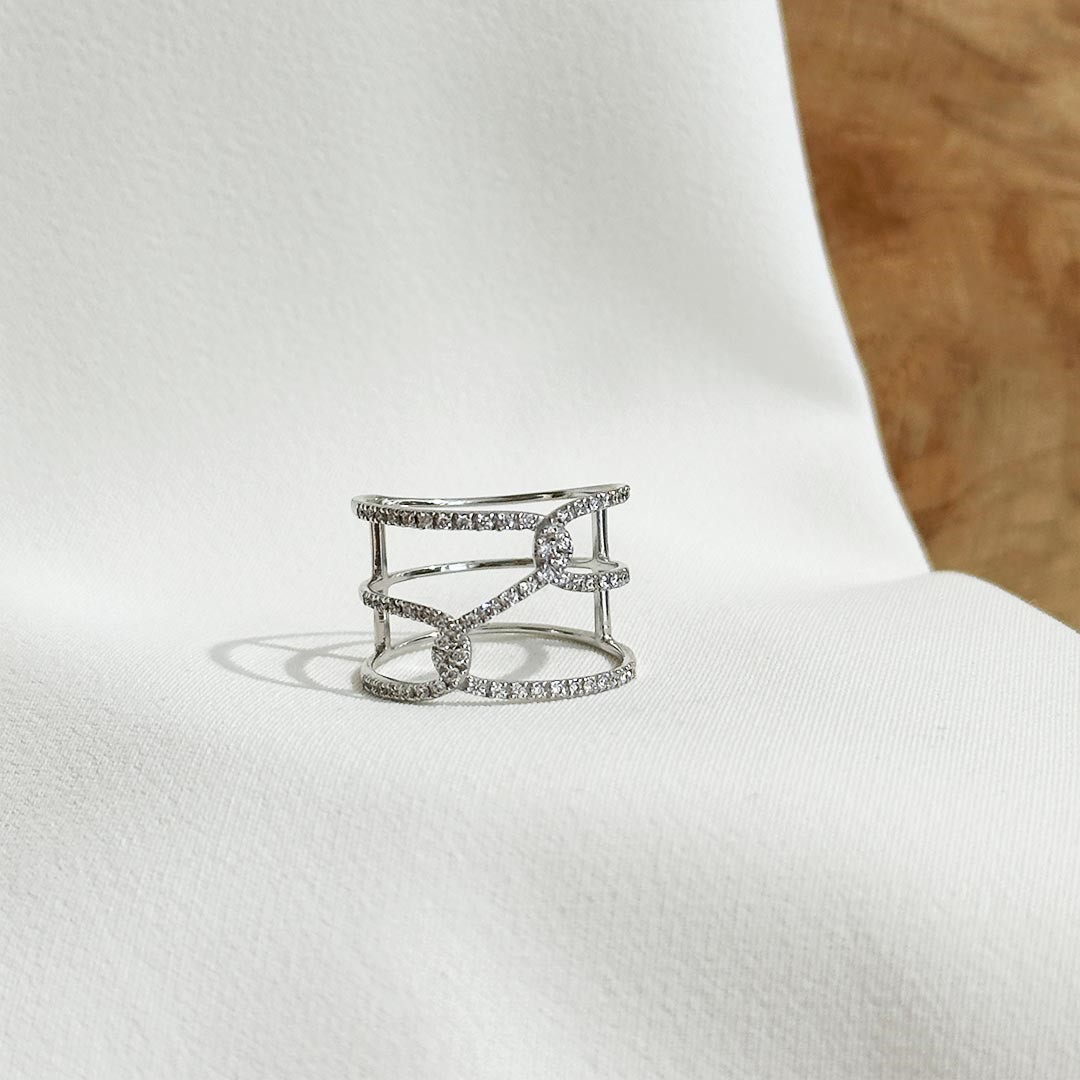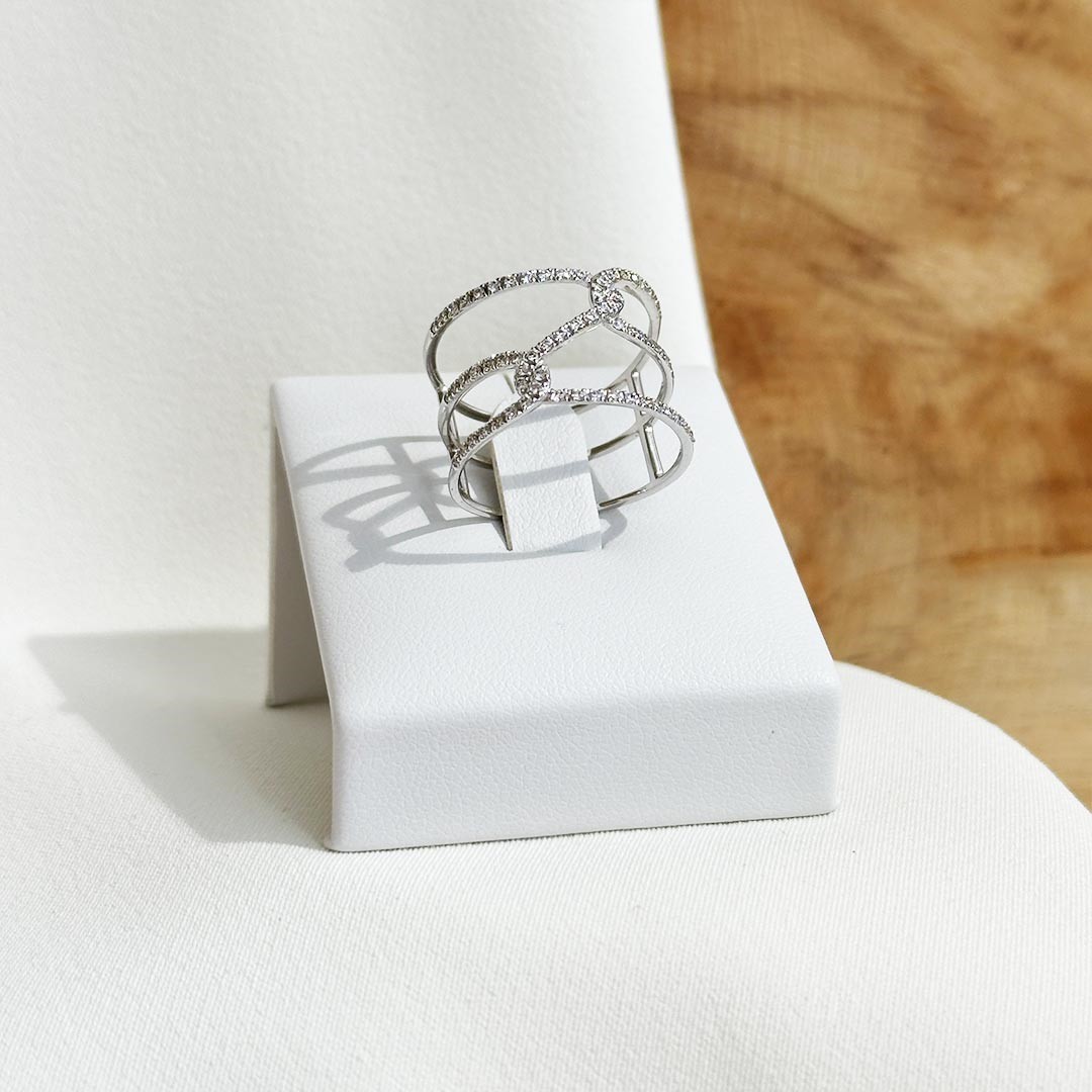 Dieser Brillantring aus 750er Weißgold überzeugt durch seine besondere Formgebung und das offene Design. Mit einer Breite von 13mm wirkt der Ring markant, bleibt dank der geschwungenen Linienführung aber dennoch angenehm zurückhaltend. Die sanfte Bewegung im Design verleiht dem Schmuckstück eine gewisse Leichtigkeit, die durch den Brillantbesatz von insgesamt 0,32ct. elegant unterstrichen wird. Ein Ring, der durch seine klare Gestaltung und hochwertige Verarbeitung zu einem treuen Begleiter im Alltag wie auch zu besonderen Anlässen wird. Der Ring ist in der Ringweite 55 in unserem Geschäft lagernd.