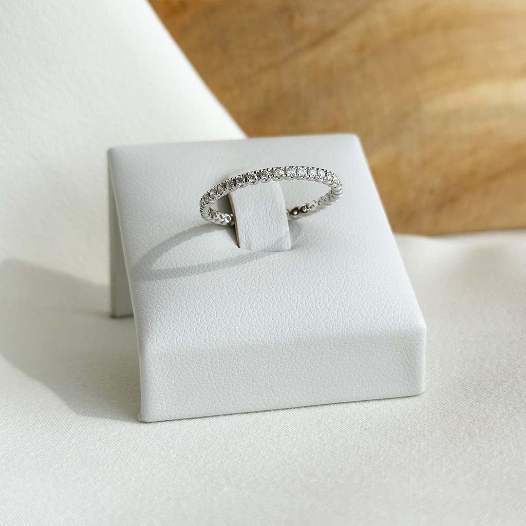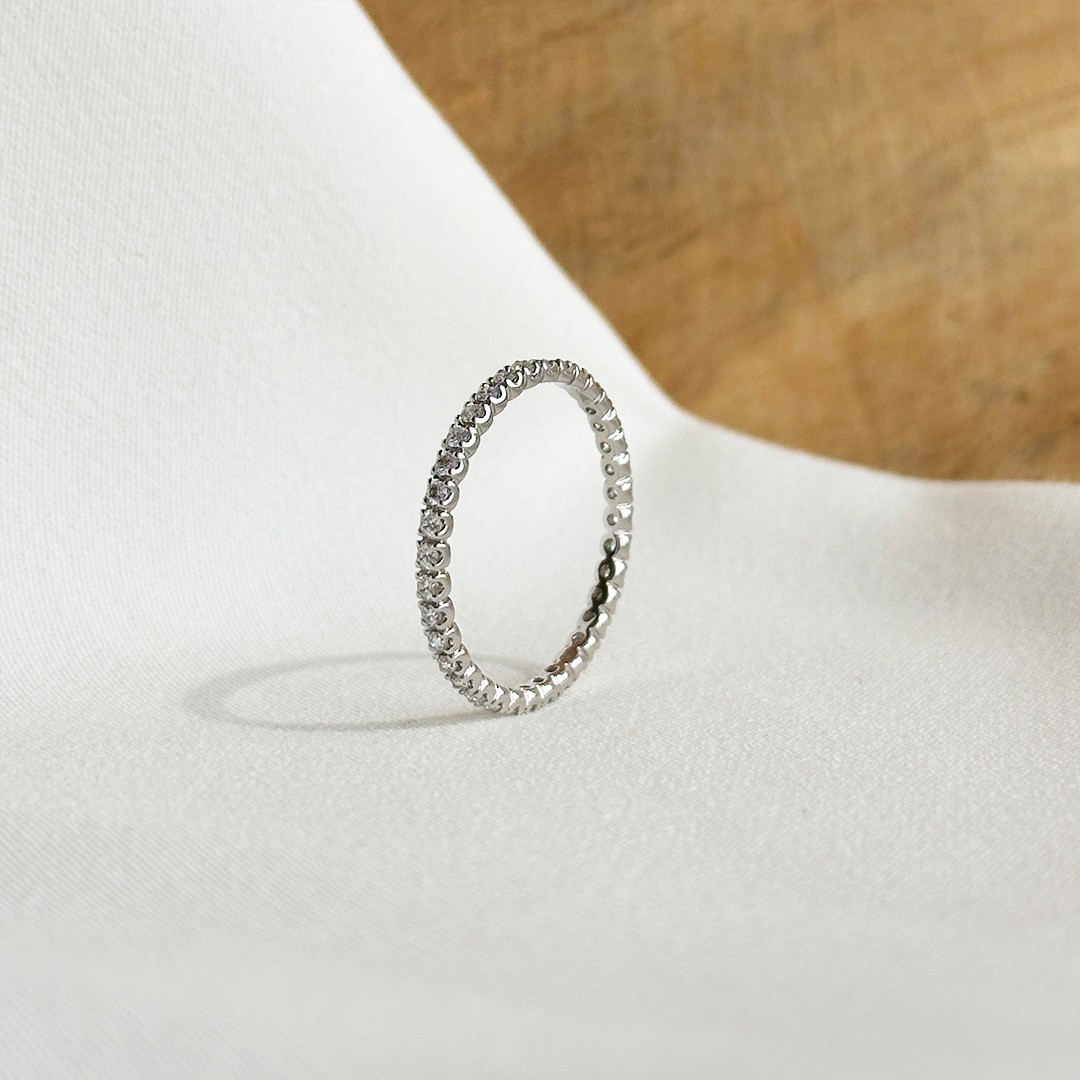Dieser Memoire-Ring aus 750er Weißgold überzeugt durch seine feine, elegante Gestaltung und eine zeitlose Ausstrahlung. Insgesamt 36 Brillanten mit zusammen 0,36ct. sind in einer klassischen Krappenfassung gefasst, sodass die einzelnen Steine besonders schön zur Geltung kommen und ein lebendiges Funkeln entsteht. Mit einer Breite von 1,9mm wirkt der Ring zart und ausgewogen und lässt sich angenehm tragen. Gerade durch seine klare Form eignet er sich wunderbar zum Kombinieren, etwa als Beisteckring zu einem Solitärring oder zusammen mit weiteren Ringen. Der Memoire-Ring ist ein vielseitiges Schmuckstück, das sowohl im Alltag als auch zu besonderen Anlässen getragen werden kann und durch seine schlichte Eleganz in jede Schmucksammlung passt. Der Ring ist in der Ringweite 54 lagernd.