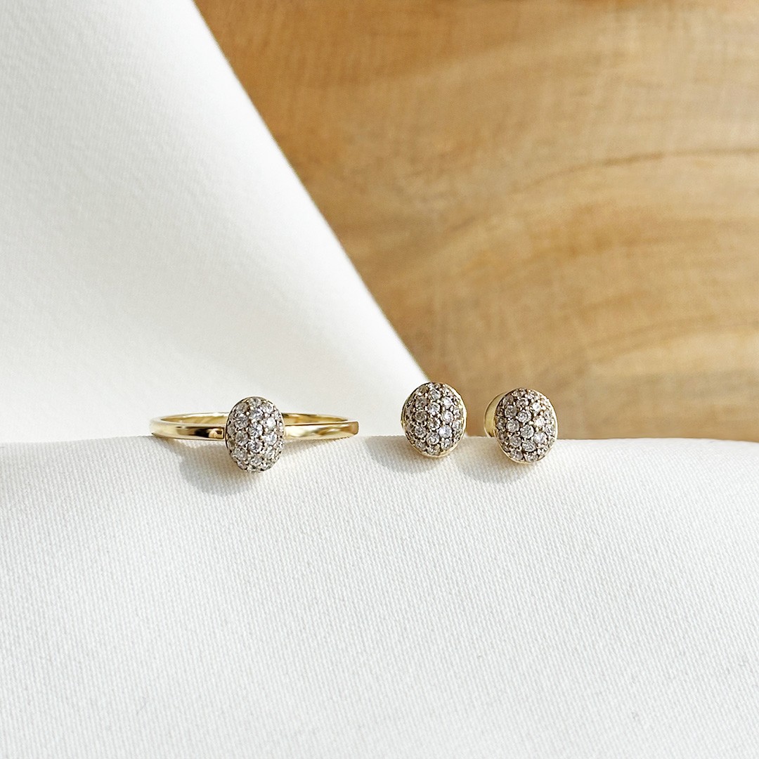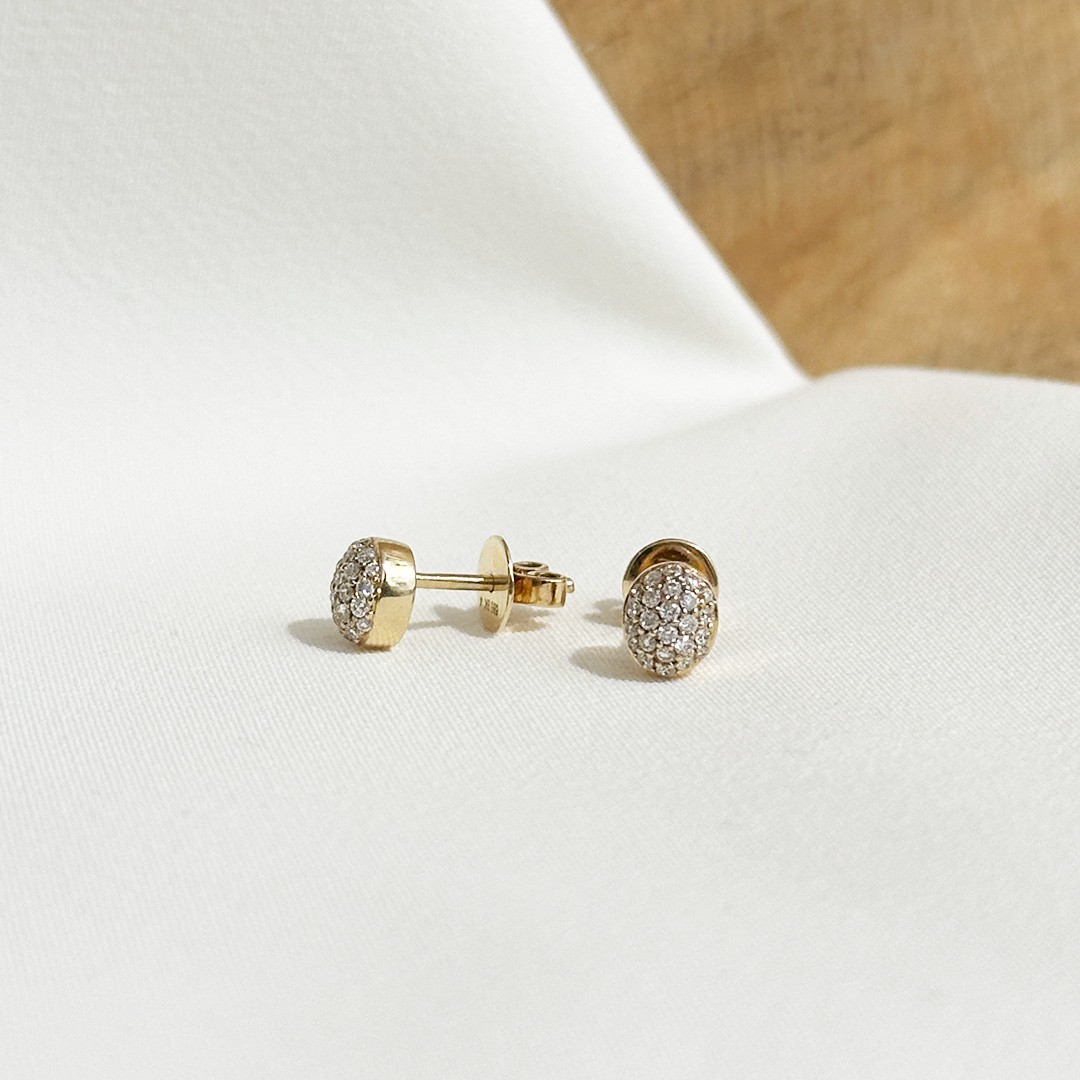 Diese Ohrstecker aus 585er Gelbgold überzeugen durch ihre feine, ovale Form und ihre elegante Ausstrahlung. Im Zentrum jedes Steckers sind zahlreiche kleine Brillanten dicht aneinandergesetzt, die zusammen 0,36ct. ergeben. Durch die sorgfältige Fassung entsteht eine geschlossene Brillanzfläche, die das Licht intensiv reflektiert und den Ohrschmuck besonders lebendig wirken lässt. Die leicht erhabene Form verleiht den Steckern eine dezente Präsenz, ohne aufdringlich zu erscheinen. Ein elegantes Paar, das sich sowohl im Alltag als auch zu besonderen Anlässen wunderbar tragen lässt. Gerne verpacken wir das Schmuckstück passend zum Anlass.