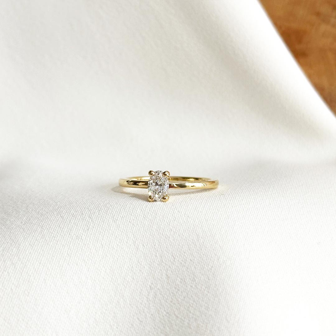 Dieser Solitaire-Ring wurde aus 750er Gelbgold handgefertigt und trägt einen oval geschliffenen Diamanten mit einem Gewicht von 0,36ct. Die schlichte, elegante Gestaltung und der moderne Schliff des Steins machen ihn zu einem begehrten Schmuckstück, das sich vielseitig kombinieren lässt – etwa mit einem Verlobungsring oder einem weiteren Diamantring. Die Fassung ist so gearbeitet, dass sich der Ring bei Bedarf unkompliziert in der Größe anpassen lässt. Aktuell ist er in Weite 52 lagernd. Ein stilvoller Solitär für alle, die feine Handarbeit und zeitloses Design schätzen.