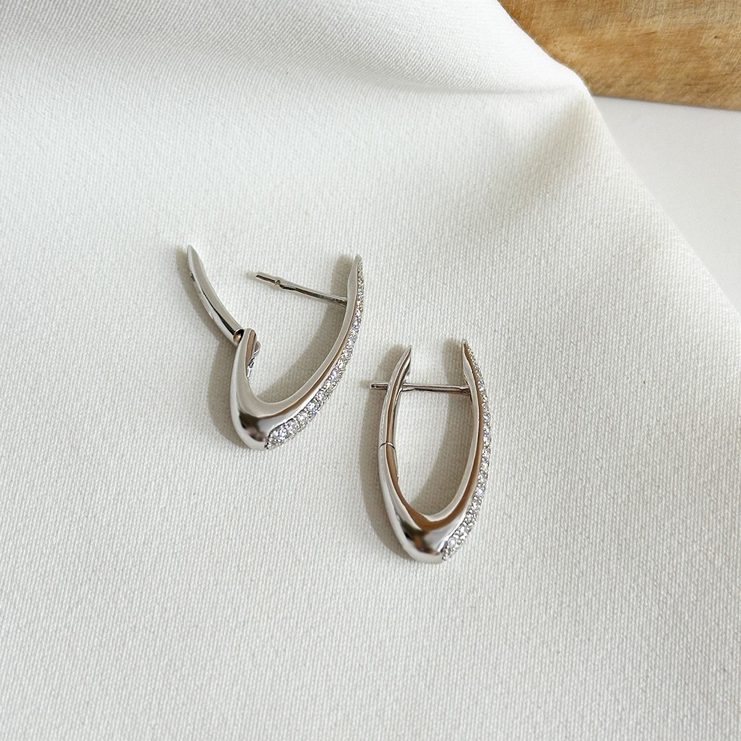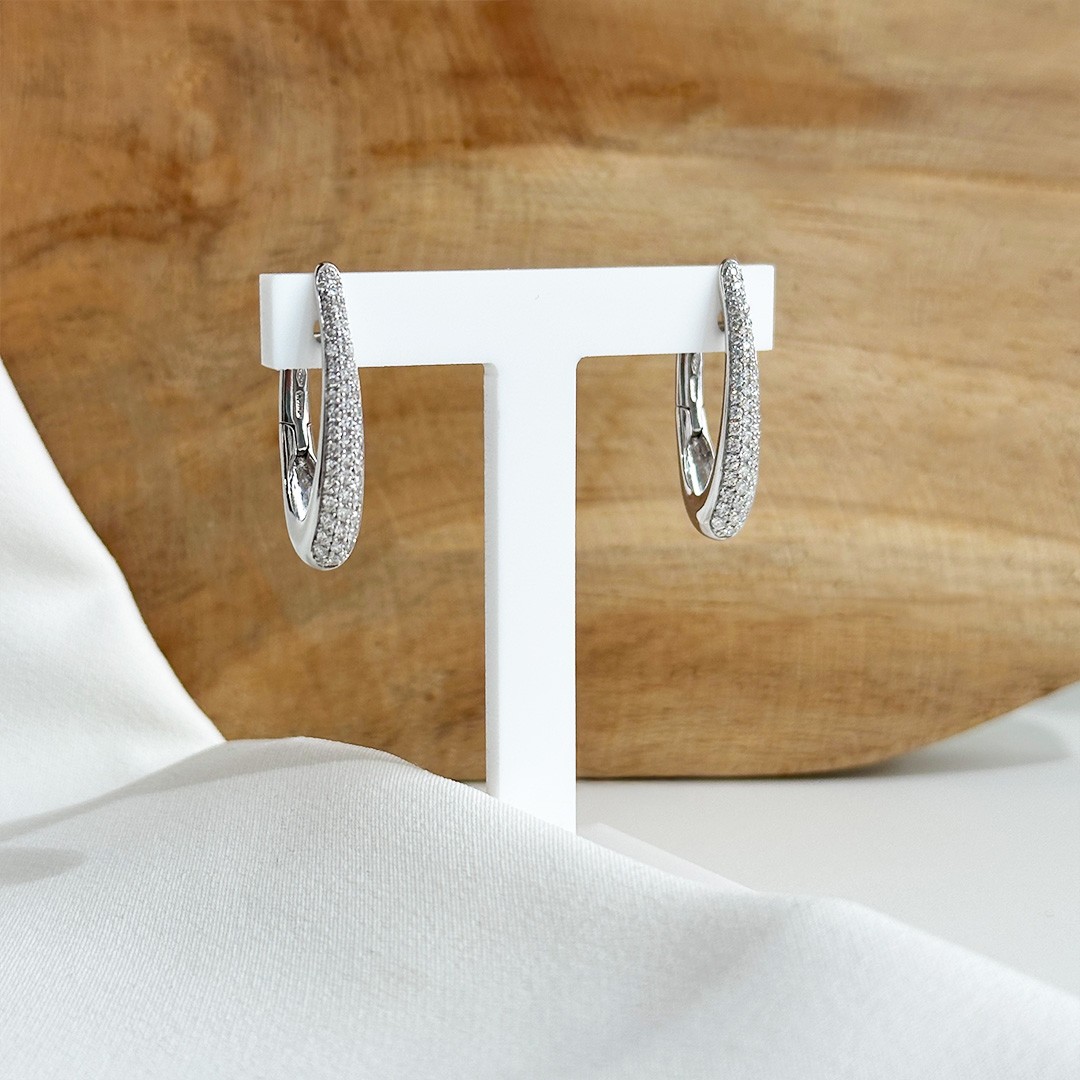 Diese Creolen aus 750er Weißgold verbinden elegante Linienführung mit funkelnder Brillanz. Die leicht ovale Form verleiht ihnen eine besondere Weichheit, während sie nach unten hin sanft breiter werden und dadurch eine schöne Präsenz am Ohr entfalten. Insgesamt 104 Brillanten mit zusammen 0,62ct. sind auf der Vorderseite gefasst und sorgen für ein lebendiges Funkeln bei jeder Bewegung. Trotz ihrer aufwendigen Ausarbeitung wirken die Creolen fein und ausgewogen und lassen sich sowohl im Alltag als auch zu besonderen Anlässen tragen. Ein eleganter Ohrschmuck für alle, die die Ausstrahlung von Diamanten schätzen und dabei eine klare, stilvolle Form bevorzugen.