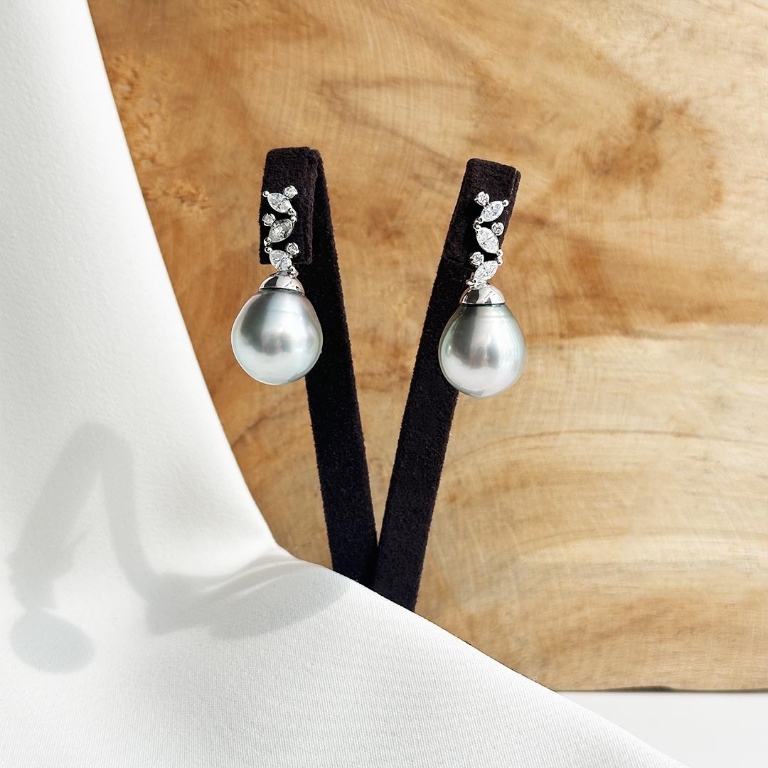 Diese handgefertigten Ohrgehänge aus 750er Weißgold verbinden edle Materialien mit einer klaren, eleganten Gestaltung. Tahitiperlen mit ihrem natürlichen, sanften Glanz bilden den Mittelpunkt des Designs und werden von feinen Diamanten im Navette-Schliff ergänzt, die für ein dezentes Funkeln sorgen. Die Ohrgehänge wurden von unserem Goldschmiedemeister mit großer Sorgfalt und viel Gespür für Proportionen gefertigt. Die harmonische Verbindung aus Perlen und Diamanten verleiht dem Schmuckstück eine zeitlose Ausstrahlung. Sie eignen sich sowohl für besondere Anlässe als auch für elegante Abendveranstaltungen und unterstreichen einen stilvollen, hochwertigen Auftritt.