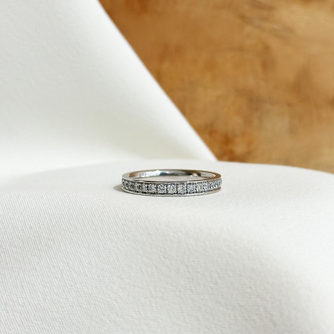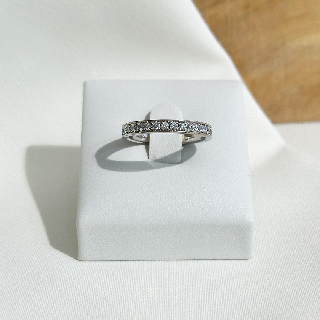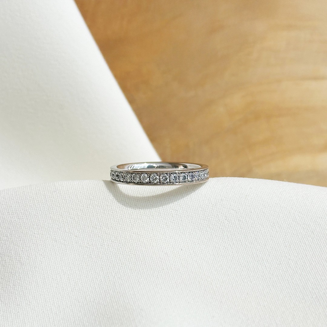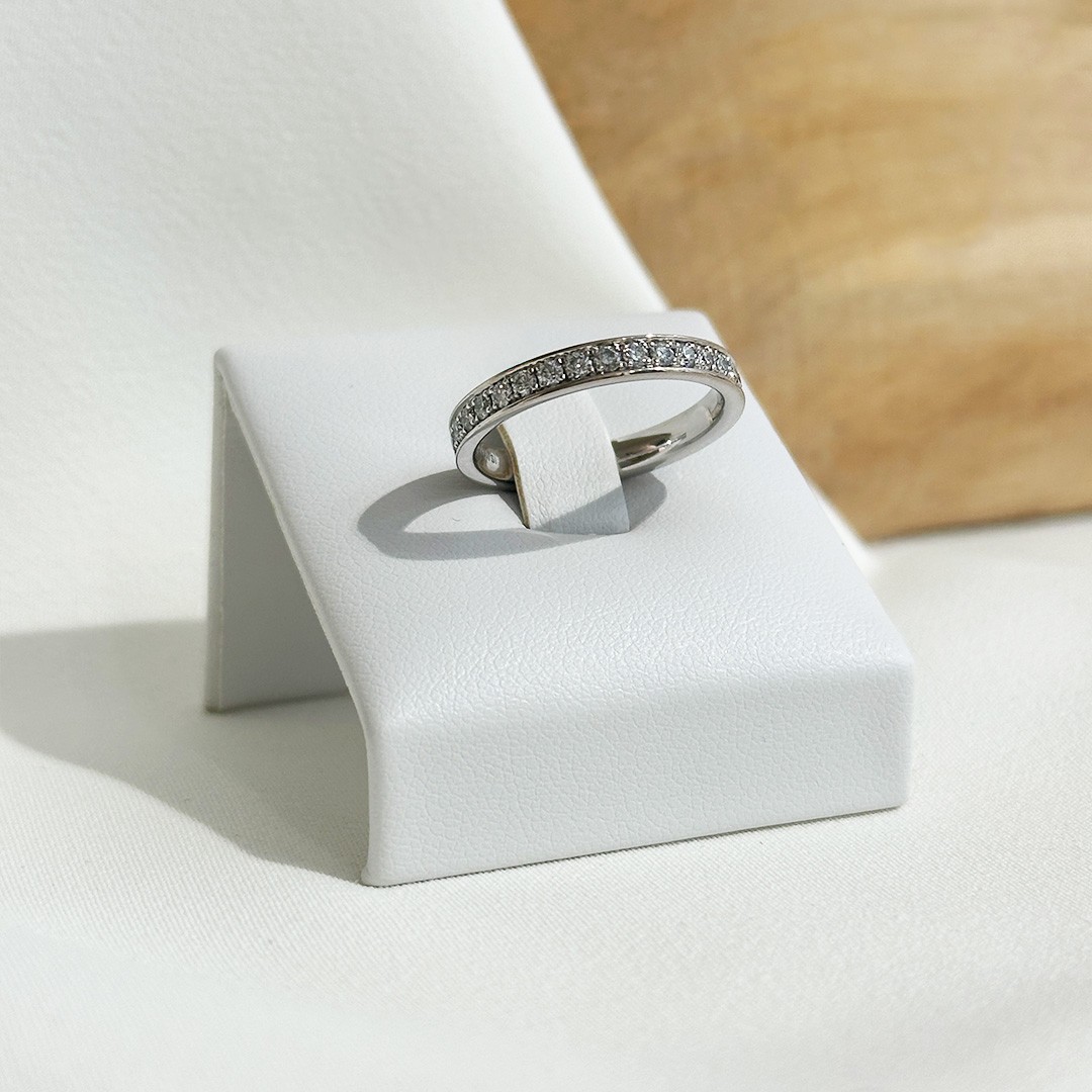 Dieser voll ausgefasste Memoire Ring beeindruckt durch seine rundum gefasste Brillantreihe und sein edles, zeitloses Erscheinungsbild. In 2,8mm Breite gefasst, schmücken 32 Brillanten im Brillantschliff den Ring mit einem Gesamtgewicht von 0,96ct. In der Ringweite 53 gefertigt, überzeugt er durch angenehmen Tragekomfort und ein gleichmäßiges Funkeln aus jedem Blickwinkel. Dieser Memoire Ring eignet sich gleichermaßen als Alternative zum klassischen Verlobungsring, als eleganter Ehering oder als Schmuckstück für jeden Tag. Er lässt sich wunderbar mit weiteren Ringen kombinieren – etwa als Beisteckring in einer anderen Goldfarbe oder zusammen mit schmalen Solitärringen – und bietet vielseitige Möglichkeiten für individuelle Kombinationen.