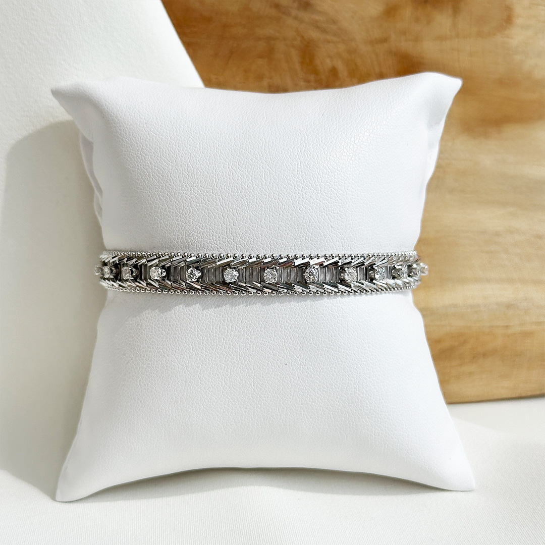 Dieses Armband aus 750er Weißgold beeindruckt durch seine außergewöhnlich aufwendige Gestaltung und eine besondere Detailtiefe. Mit einer Breite von etwa 8mm wirkt es präsent und zugleich fein durchdacht. Das Design ist raffiniert aufgebaut: Außen rahmen runde Elemente das Armband ein, dazwischen setzen schräg angesetzte Weißgoldglieder markante Akzente. Verbunden werden diese Elemente durch feine Stege, die dem Schmuckstück Struktur und Stabilität verleihen und zugleich eine spannende, architektonische Wirkung erzeugen. In regelmäßigen Abständen sind kleine Diamanten in Krappenfassungen eingesetzt, die dem Weißgold ein lebendiges Funkeln hinzufügen und das Design zusätzlich veredeln. Durch die flächige Ausarbeitung liegt das Armband angenehm am Handgelenk und entfaltet eine eindrucksvolle, elegante Präsenz. Ein besonderes Schmuckstück mit raffinierter Handwerkskunst, das sofort ins Auge fällt und dennoch stilvoll bleibt.