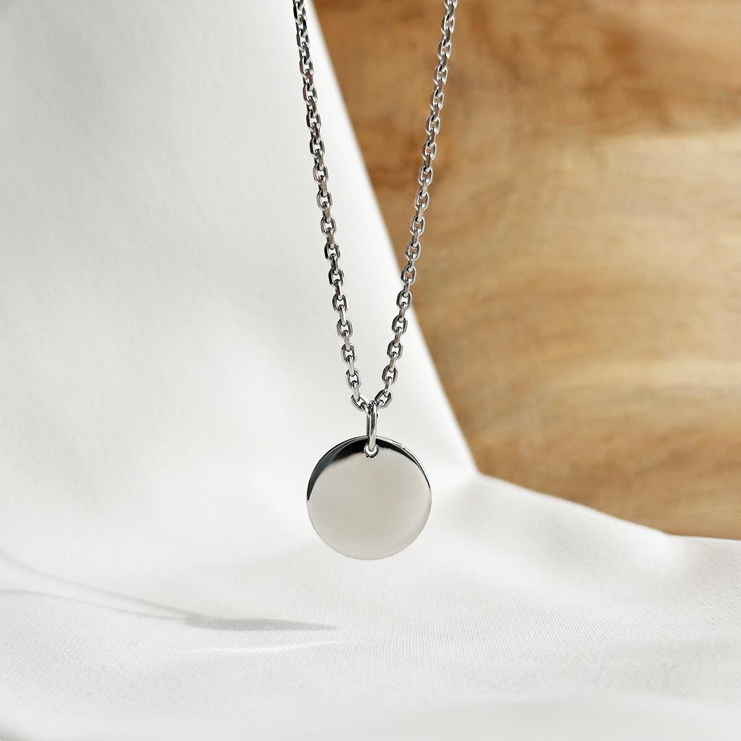 Diese runde Gravurplatte aus 585er Weißgold hat einen Durchmesser von 15mm und eine polierte Oberfläche, die dezent schimmert. Sie bietet Platz für eine persönliche Gravur und kann so zu einem ganz individuellen Schmuckstück werden. Besonders schön lässt sie sich mit weiteren Anhängern kombinieren, etwa mit Symbolen oder kleinen Charms. Passende Goldketten in verschiedenen Längen und Stärken finden Sie selbstverständlich ebenfalls in unserem Sortiment.