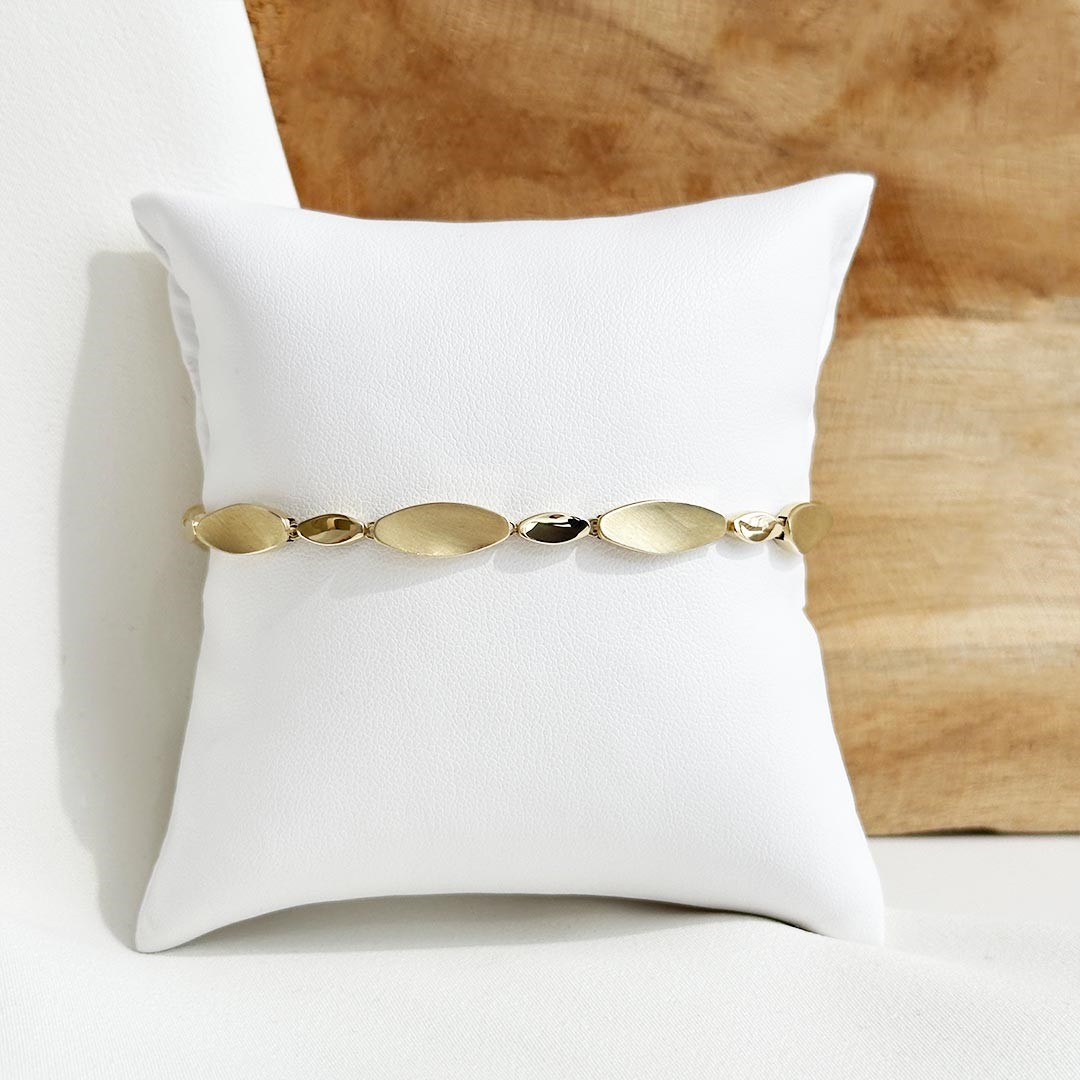 Dieses Armband aus 585 Gelbgold vereint Eleganz und Unaufdringlichkeit auf stilvolle Weise. Die abwechselnd mattierten und polierten Elemente verleihen dem klassischen Design eine moderne Leichtigkeit und sorgen für eine lebendige Oberflächenstruktur. Es liegt angenehm am Handgelenk und ergänzt jedes Outfit auf zurückhaltend raffinierte Art. Ob im Büro oder bei einem besonderen Anlass – dieses Armband setzt stets einen stilsicheren Akzent, ohne sich in den Vordergrund zu drängen.