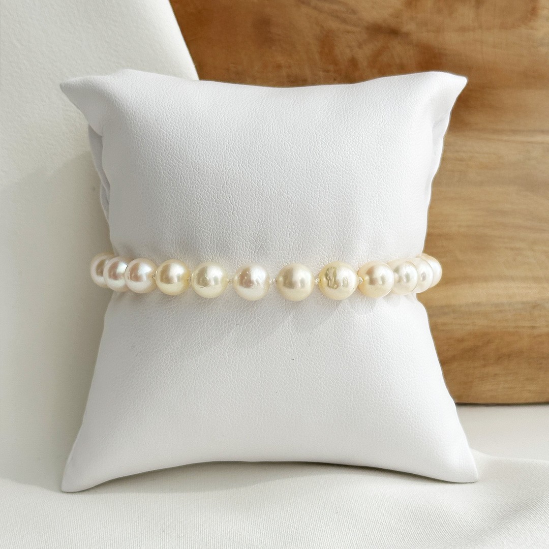 Dieses elegante Armband besticht durch Akoyaperlen mit einer Größe von 6 bis 7mm und einem sanften, leicht roséfarbenen Schimmer – ein besonders geschätztes Merkmal dieser Perlenart. Mit einer Länge von 19cm liegt es geschmeidig am Handgelenk und lässt sich dank des Karabiners aus 925 Silber mühelos schließen. Es wirkt fein und edel zugleich und harmoniert wunderbar mit weiterem Perlenschmuck. Ein vielseitiges Schmuckstück, das jedem Stil eine klassische Note verleiht.