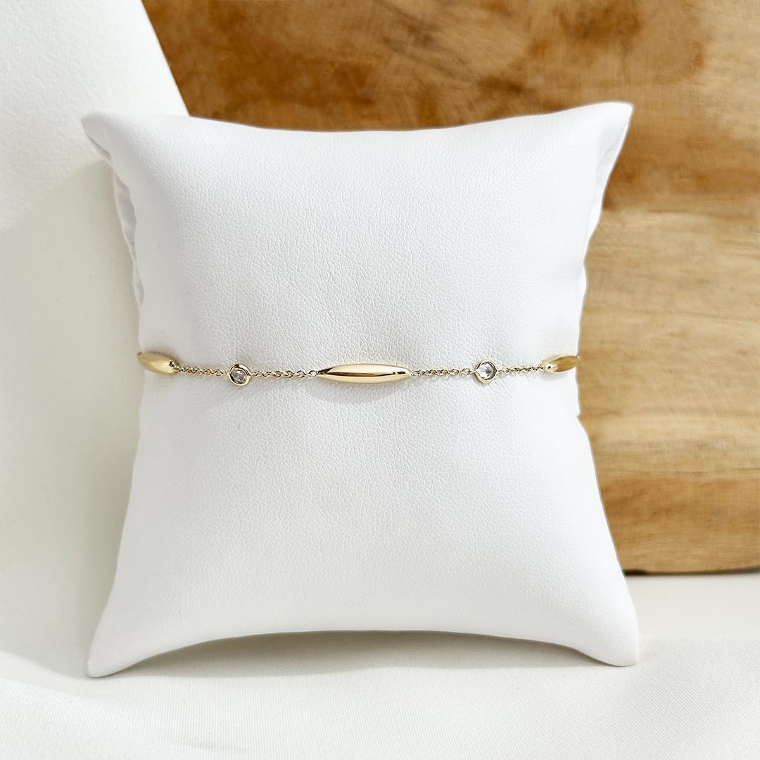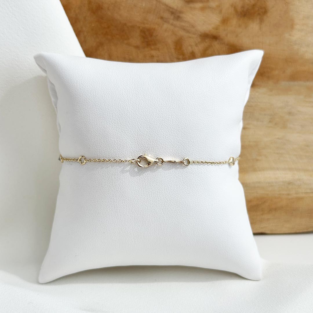 Dieses zarte Armband aus 585er Gelbgold überzeugt mit feiner Verarbeitung und dezentem Glanz. Kleine Zirkonia sind in kugelförmigen Fassungen eingefasst und hängen in regelmäßigem Abstand locker an der filigranen Kette. Durch ihre bewegliche Aufhängung fangen die Steine bei jeder Bewegung das Licht ein und sorgen für ein lebendiges Funkeln. Mit einer Länge von 19cm und einer praktischen Zwischenöse bei 17cm lässt sich das Armband individuell anpassen und angenehm tragen – ein feines Schmuckstück, das Leichtigkeit und Glanz auf stilvolle Weise verbindet.