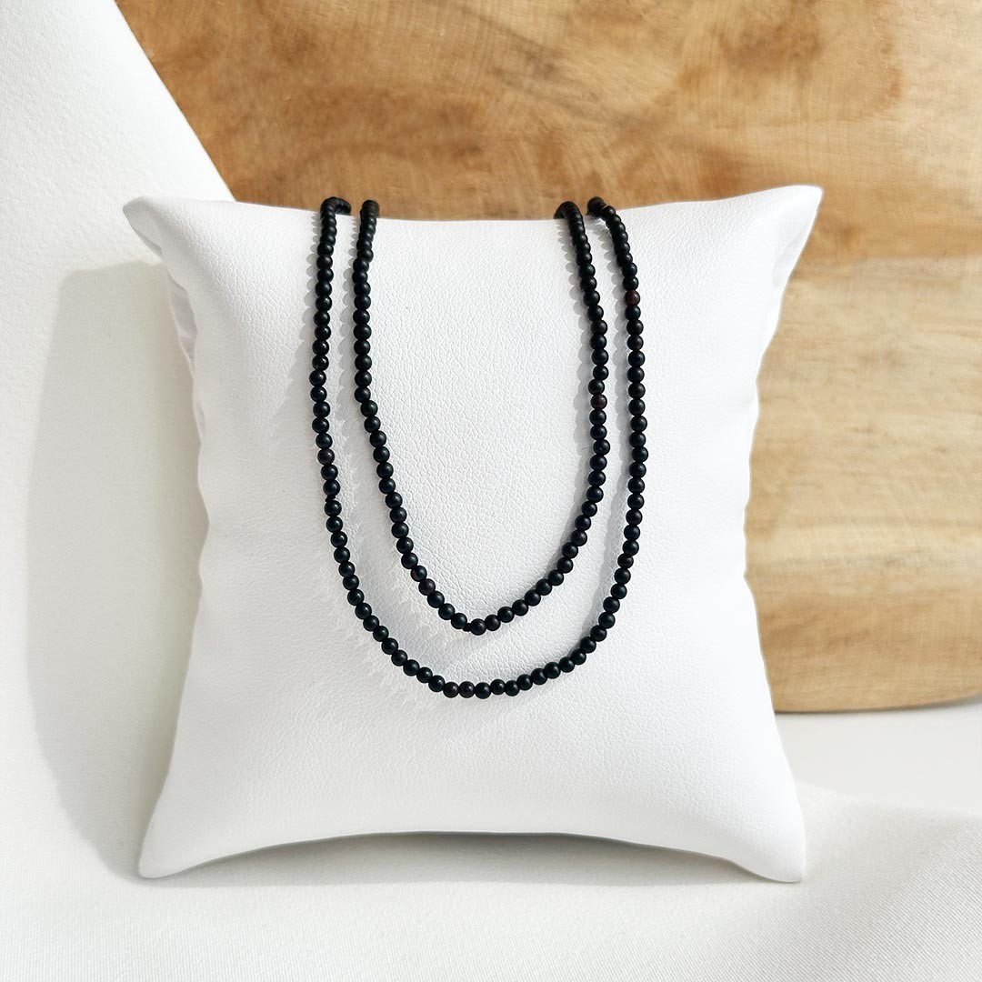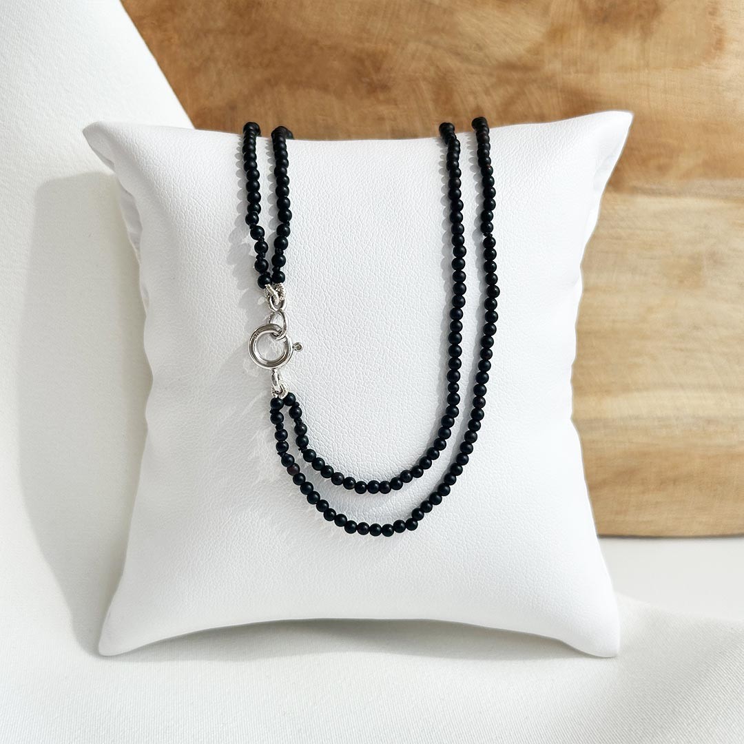 Diese zweireihige Kette besteht aus kleinen, schwarzen Onyx-Kugeln, die für eine elegante und zeitlose Optik sorgen. Mit einer Länge von 45cm liegt sie perfekt am Hals und eignet sich sowohl zum Alleintragen als auch für größere Anhänger. Der hochwertige Springring aus 585er Weißgold sorgt für sicheren Halt und eine stilvolle Ergänzung zum dunklen Glanz des Onyx. Ob als raffinierter Blickfang im Alltag oder als stilvolles Accessoire zu besonderen Anlässen – diese Kette verleiht eine besondere Note.