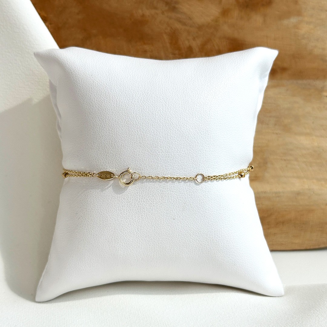 Dieses Armband aus 585er Weiß- und Gelbgold besticht durch seine feine doppelte Ausführung und eine variable Länge von 19cm, die dank einer Zwischenöse bei 17cm flexibel getragen werden kann. Zwei schmale Ketten sind mit kleinen, polierten Würfeln in Weiß- und Gelbgold kombiniert, die dem Design eine lebendige Note verleihen. Durch die glatten Oberflächen dieser Elemente bricht das Licht auf elegante Weise, sodass ein dezentes Funkeln entsteht – ganz ohne Steinbesatz. Ein stilvolles Schmuckstück, das Leichtigkeit ausstrahlt und sich wunderbar vielseitig tragen lässt.