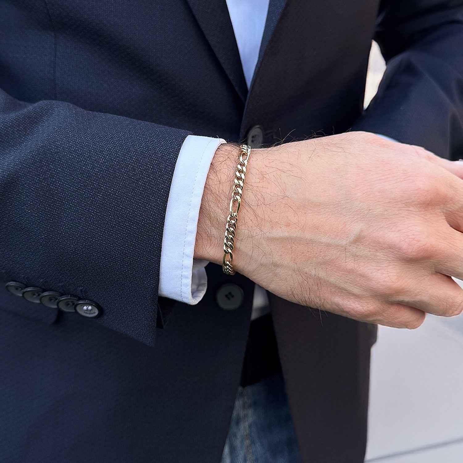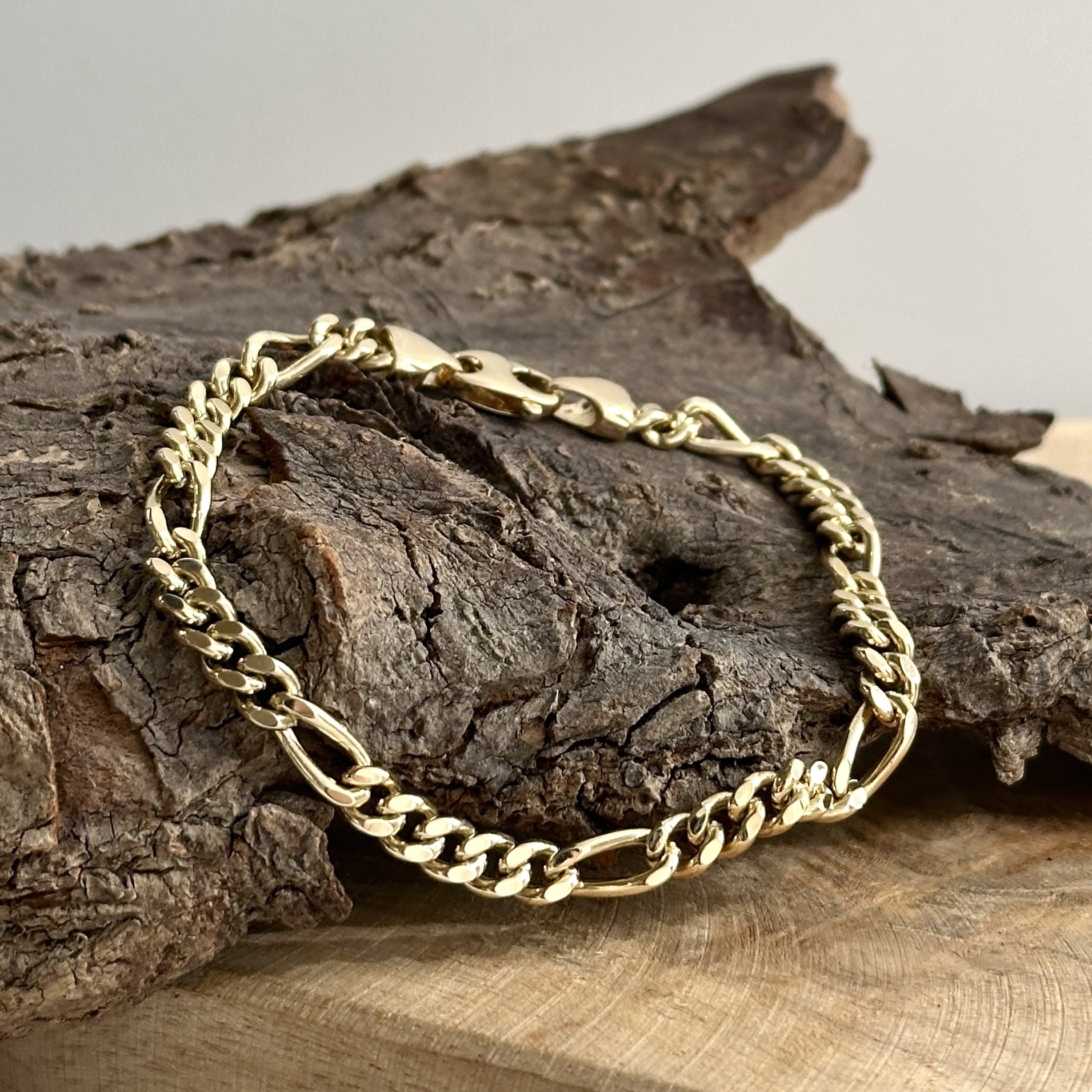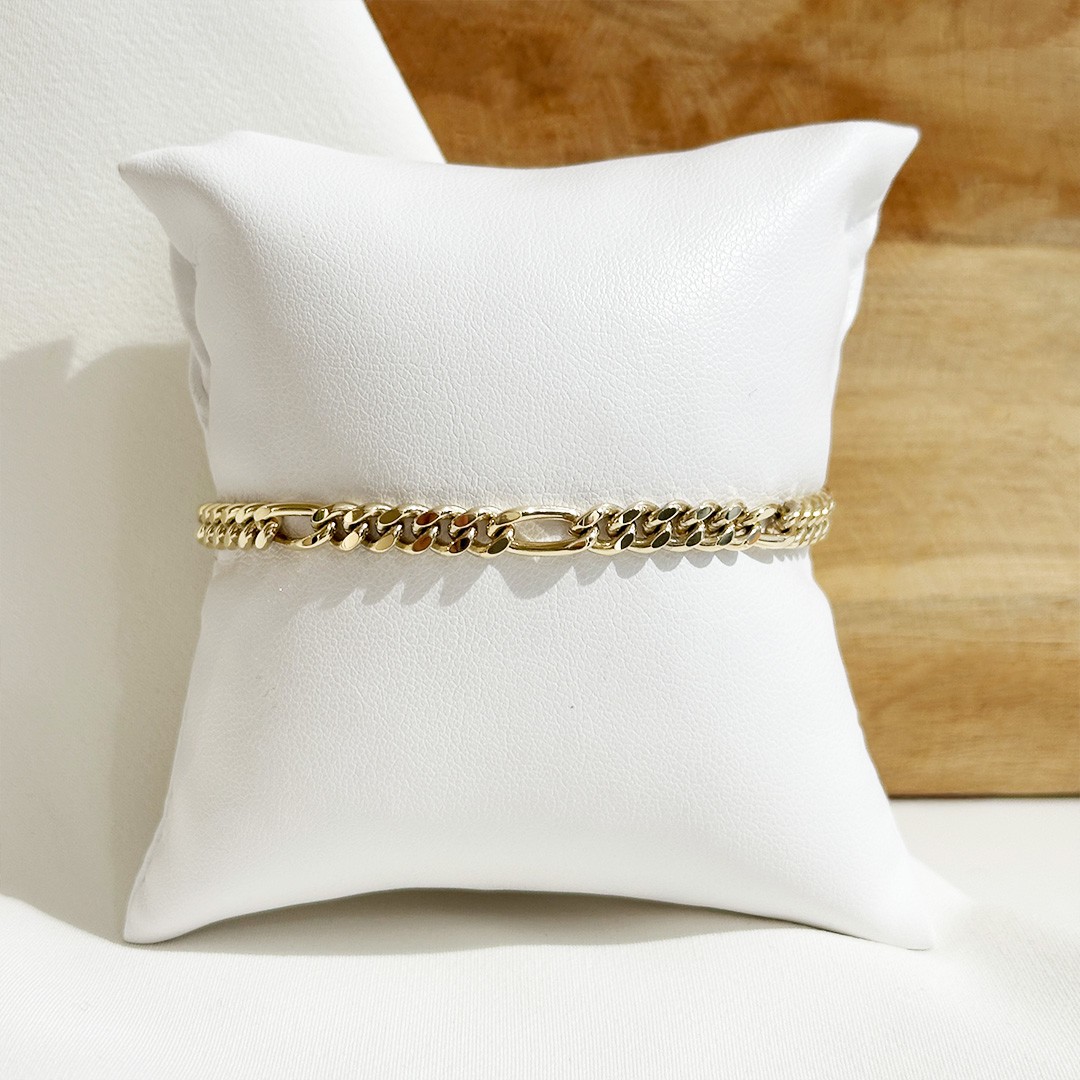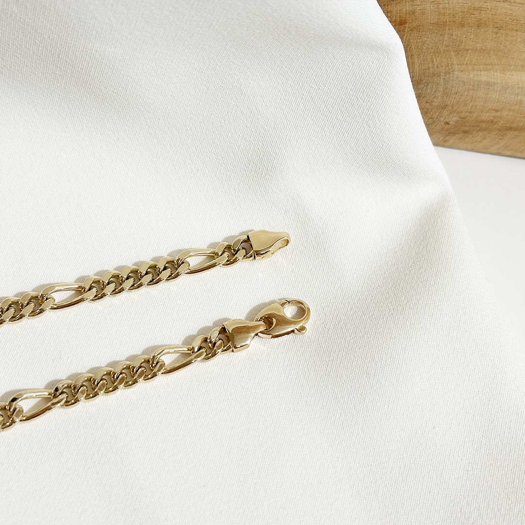 Figaro Goldarmband aus 585er Gelbgold mit einer Länge von 20cm und einer Breite von 5mm. Dieses Armband kann von Damen und Herren gleichermaßen getragen werden. Das Figaro-Muster ist eine besondere Art von Panzerkette mit einer speziellen Anordnung der Glieder. Ihre Glieder wechseln zwischen fünf runden und einem ovalen Kettenglied. Dadurch entsteht das klassische Design der Figarokette. Unser Figaro Goldarmband ist auch in anderen Längen erhältlich.