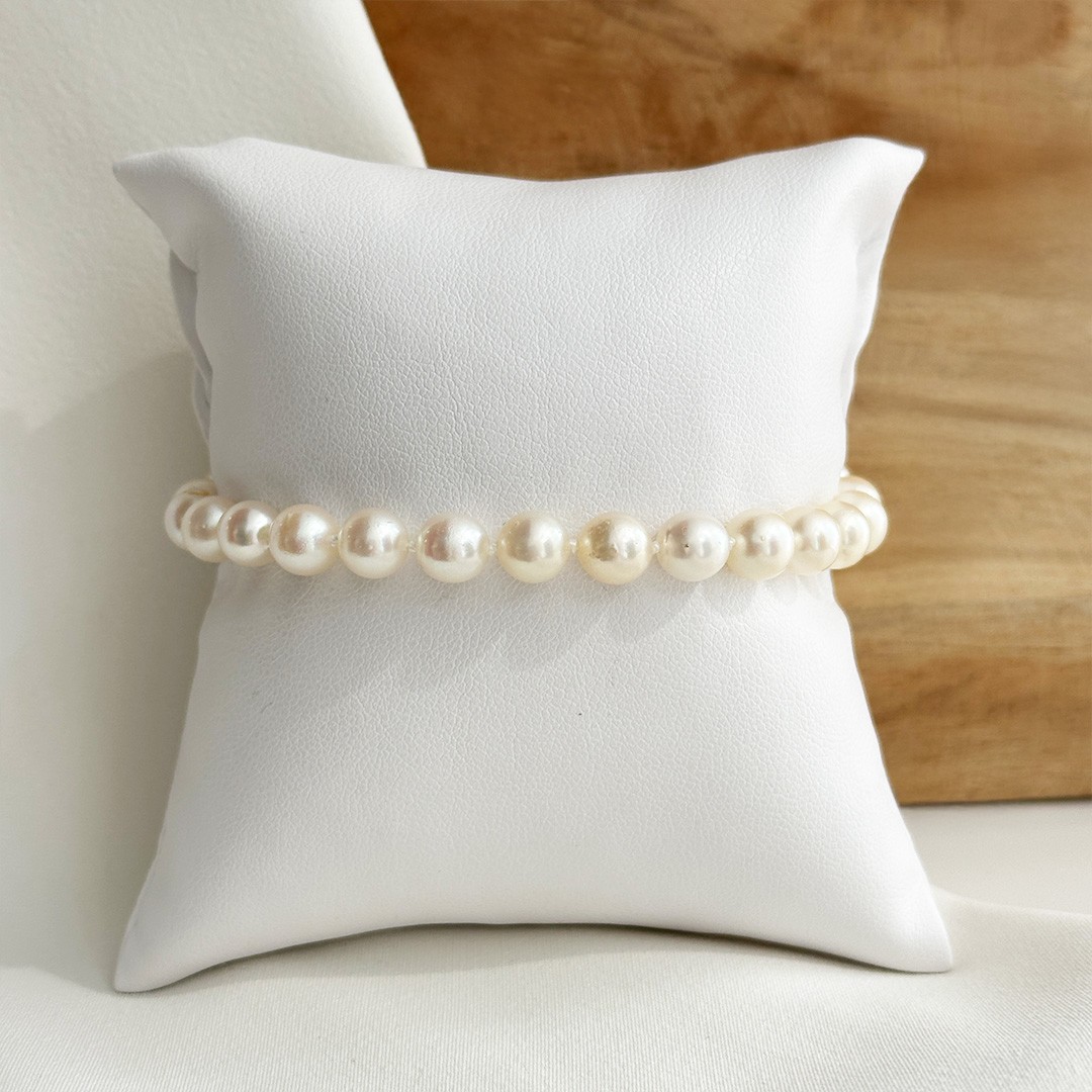 Dieses klassische Perlenarmband besteht aus gleichmäßig runden Akoyaperlen mit einem Durchmesser von 7mm. Der sanfte Lüster der Perlen verleiht dem Armband eine elegante Ausstrahlung. Geschlossen wird es mit einem schlichten Karabiner aus 925 Silber, der sich leicht anlegen lässt und sicher hält. Mit einer Länge von 20cm liegt das Armband angenehm am Handgelenk und lässt sich vielseitig kombinieren – sowohl mit Goldarmbändern als auch mit feinem Weißgoldschmuck. Ein zeitloses Schmuckstück für jeden Tag und viele Anlässe.