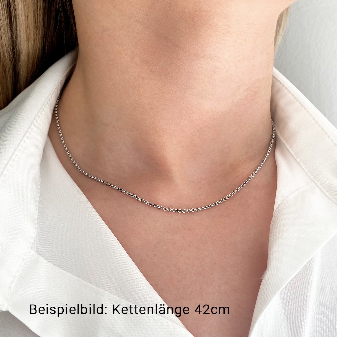 Diese 42cm lange Erbskette aus 585 Weißgold mit einer Stärke von 2mm überzeugt durch ihre klassische und zugleich elegante Ausstrahlung. Die erbsenförmigen, runden Glieder sind abwechselnd vertikal und horizontal angeordnet und sorgfältig verlötet, was der Kette ihre gleichmäßige, harmonische Optik verleiht. Diese zeitlose Kette eignet sich hervorragend, um alleine getragen zu werden, wirkt aber ebenso schön in Kombination mit einem passenden Anhänger. Durch das kühle Weißgold erhält die Erbskette einen dezenten Glanz, der sie zu einem vielseitigen Schmuckstück für den Alltag und besondere Anlässe macht. Tipp zur Kettenlänge: Als Orientierung gelten folgende Standardlängen – für Damen meist 42–45cm, für Herren 50–60cm und für Kinder etwa 36–40cm.