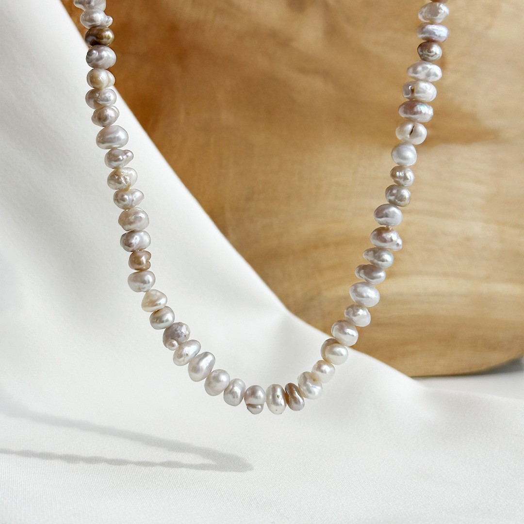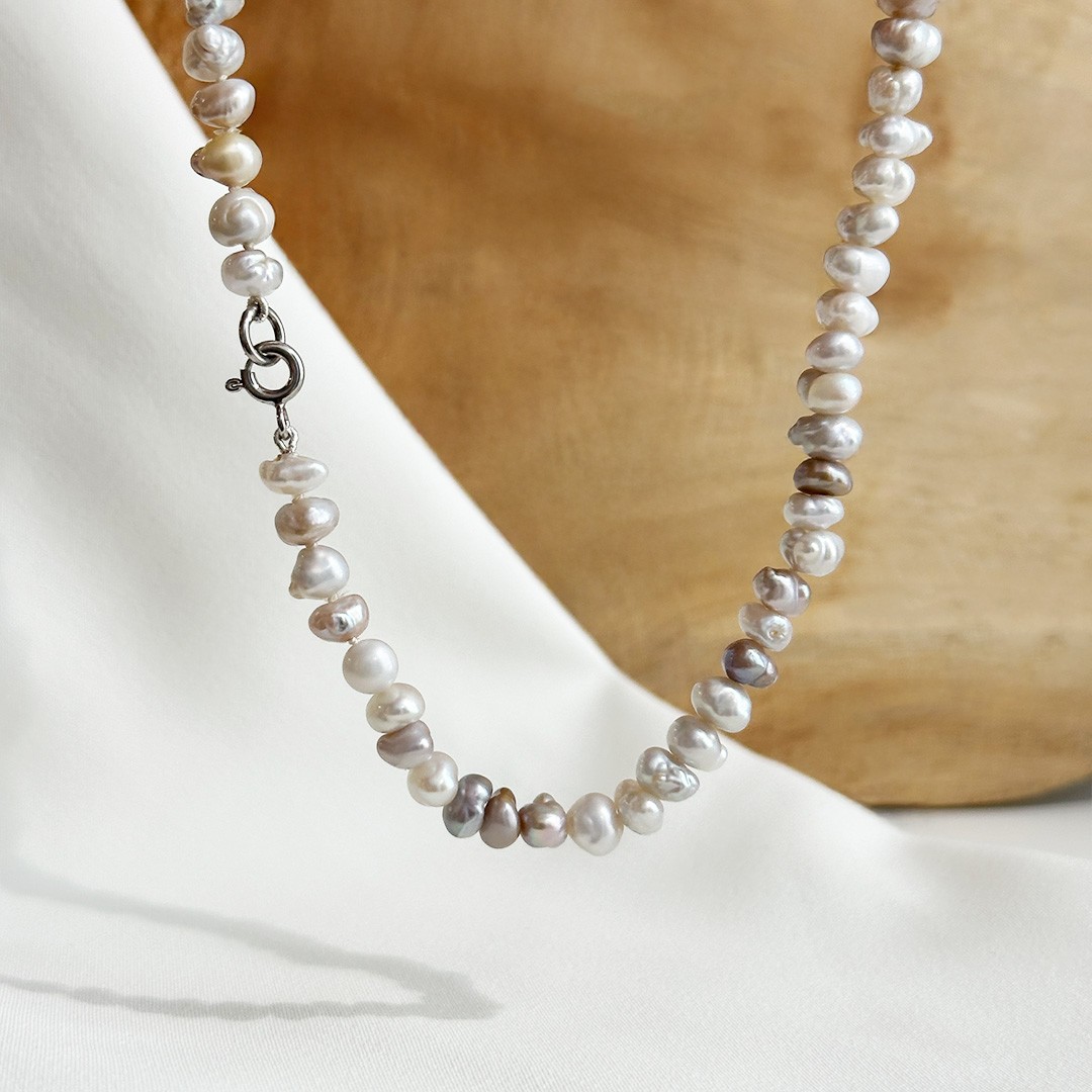 Diese Perlenkette ist eine modische Variante der klassischen Perlenkette. Die unregelmäßig geformten Süßwasserperlen mit einer Größe von ca. 5,5–7mm verleihen ihr einen modernen, natürlichen Charakter. Besonders die Farbvielfalt der einzelnen Perlen und der sanfte Schimmer beeindrucken sofort. Mit einer Länge von 42cm legt sie sich angenehm an den Hals, während der schlichte Karabiner aus 925 Silber dezent im Nacken verborgen bleibt. Ein vielseitiges Schmuckstück, das sich mühelos mit Goldschmuck, Anhängern oder passenden Ohrringen kombinieren lässt.