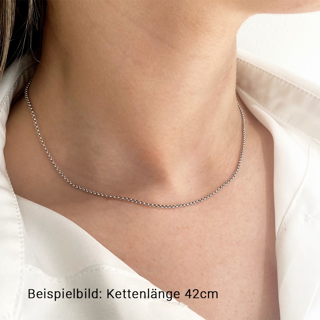 Erbs-Goldkette aus 585 Weißgold mit einer Länge von 42cm und 1,7mm Stärke für Damen. Für Herren empfehlen wir Kettenlängen ab 50cm. Erbsketten erhalten ihren Namen durch die erbsenförmigen Glieder und sind bekannt für ihre Eleganz und zeitlose Ästhetik. Alle kreisrunden Kettenglieder sind abwechselnd vertikal und horizontal angeordnet und verlötet. Unsere Standard-Goldketten werden in Österreich hergestellt und sind in 585 oder 750 Gelb-, Weiß- und Roségold in verschiedenen Längen und Stärken erhältlich.