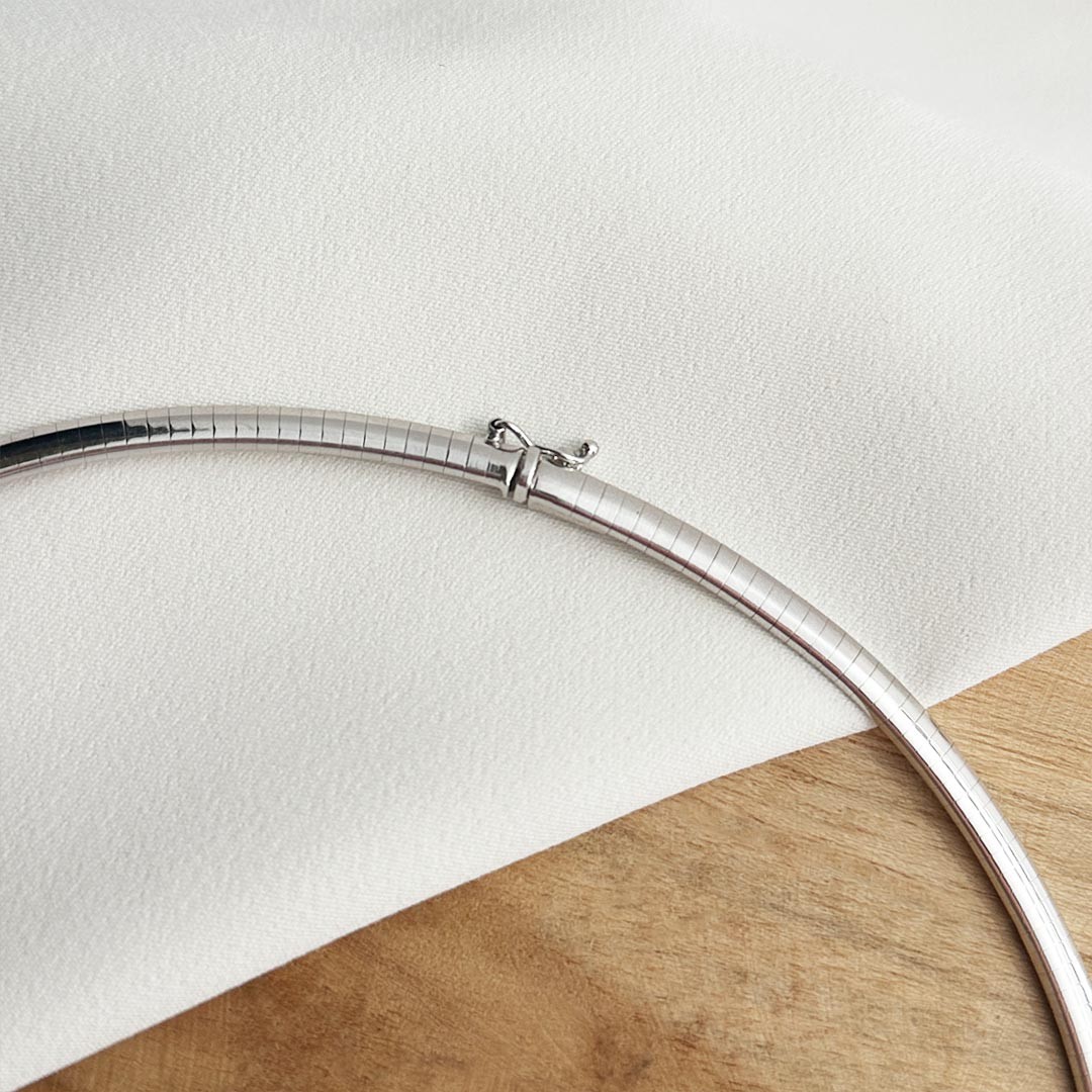 Dieser Halsreif aus 585er Weißgold hat eine Länge von 43cm und eine markante Breite von 4mm. Durch die sanft gewölbte Ausführung legt er sich angenehm an den Hals und bewahrt dank seiner formstabilen Fertigung dauerhaft seine elegante Rundung. Das schlichte, klare Design lässt dem Anhänger den nötigen Raum zur Entfaltung, kann aber ebenso gut solo getragen werden. Seine zurückhaltende Präsenz macht ihn zu einem vielseitigen Schmuckstück – ob im Alltag oder zu festlichen Anlässen. Besonders harmonisch wirkt er in Kombination mit klassischem Brillantohrschmuck oder einer schlichten Perlenkette.