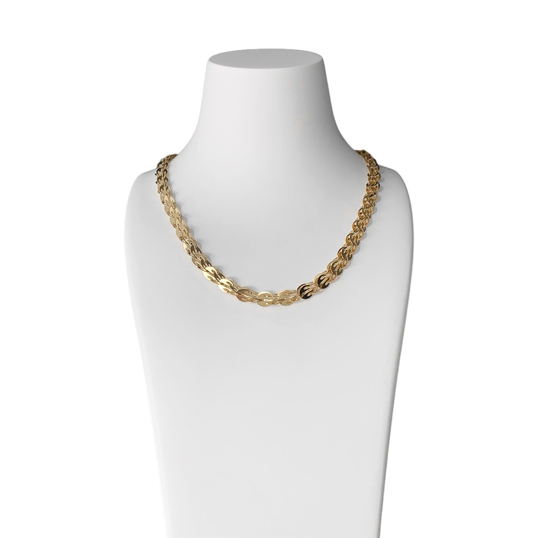 Diese Goldkette aus 585er Gelbgold für Damen ist ein wahrer Blickfang. Die Goldkette besteht aus zarten Plättchen, die auf eine besondere Art und Weise angeordnet sind und dadurch eine dreidimensionale Optik erzeugen. Dieses Collier ist ein perfektes Accessoire für besondere Veranstaltungen, aber auch für den Alltag, wie zum Beispiel für ein stilvolles Business-Outfit. Die Goldkette hat eine Länge von 44cm.