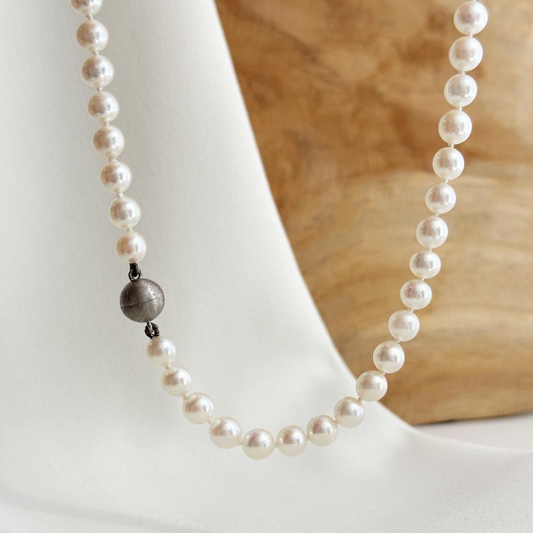 Diese Akoyaperlenkette aus unserer hauseigenen Kollektion „meine erste Perle“ ist ein zeitloses Schmuckstück mit einer Länge von 45cm und einer Perlengröße von 5,5 bis 6 mm. Die eleganten Perlen sind schmeichelnd und passen zu jedem Anlass. Die 585er Weißgold Magnetschließe kann auch als Blickfang seitlich vorne getragen werden und bietet dank des verbödeten Magneten einen sicheren Halt. Diese Kette ist besonders praktisch und ideal für alle, die zarten Schmuck lieben, vor allem für junge Frauen. Kombinieren Sie diese Kette mit schlichten Ohrsteckern, um eine harmonische Schmuckkombination zu kreieren und Ihren Stil zu unterstreichen. Entdecken Sie die zeitlose Eleganz und das bezaubernde Design dieser Akoyaperlenkette und bereichern Sie Ihre Schmucksammlung mit diesem wunderbaren Schmuckstück.
