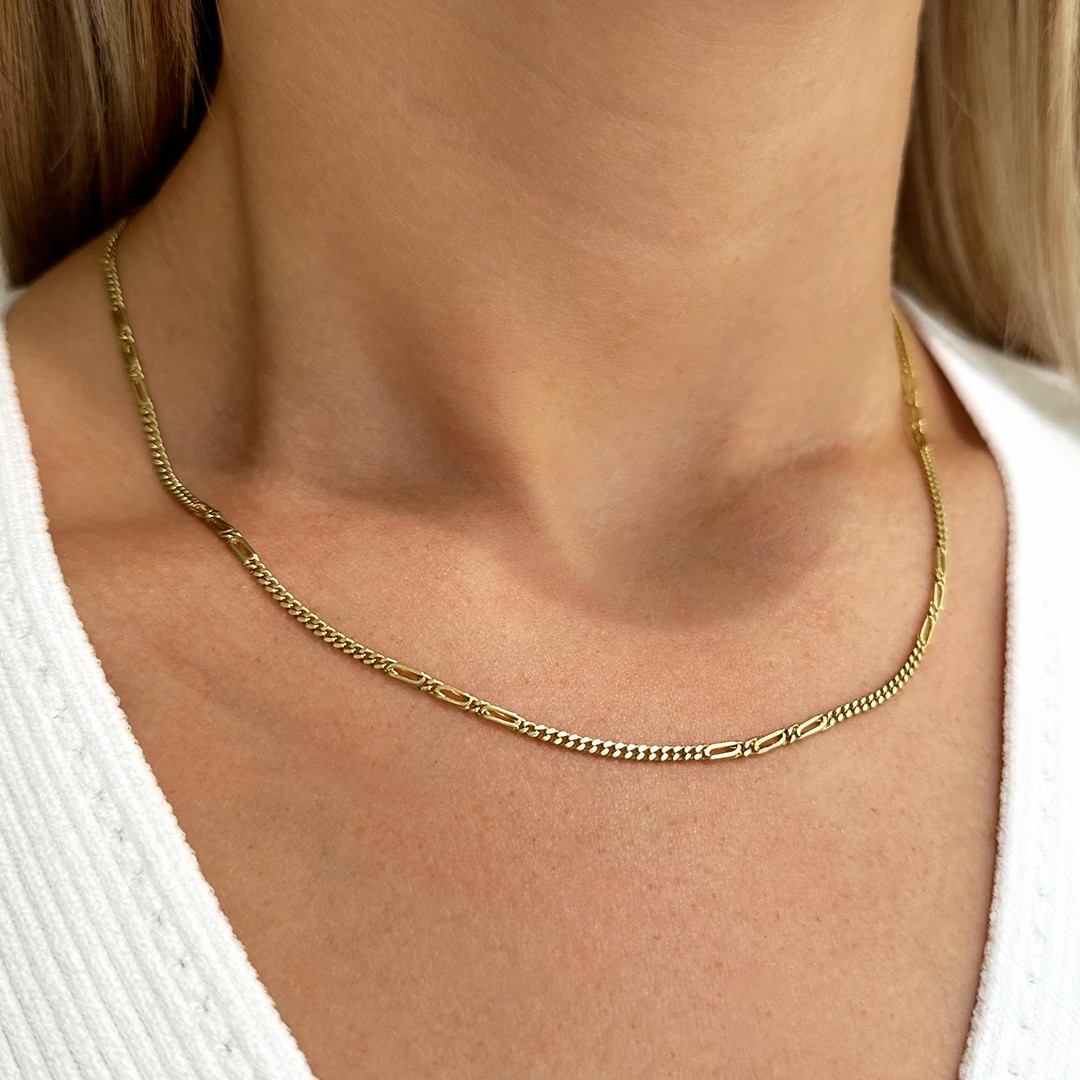 Diese Goldkette für Damen aus 585 Gelbgold verbindet klassische Eleganz mit einer markanten Note. Das Design präsentiert eine traditionelle Panzerkette, die in regelmäßigen Abständen von markanten Gliedern durchbrochen wird, um eine einzigartige Ausstrahlung zu schaffen. Mit einer Länge von 45cm liegt sie perfekt an und betont Ihre Eleganz. Die Breite von ca. 2,2mm macht das Tragen zum Vergnügen und die massive Verarbeitung gewährleistet Langlebigkeit. Diese Kette ist vielseitig und kann wunderbar mit anderen Ketten kombiniert werden, um Ihren eigenen Stil zu kreieren. Ob solo getragen oder in Kombination mit anderen Schmuckstücken, diese Goldkette ist ein Blickfang.