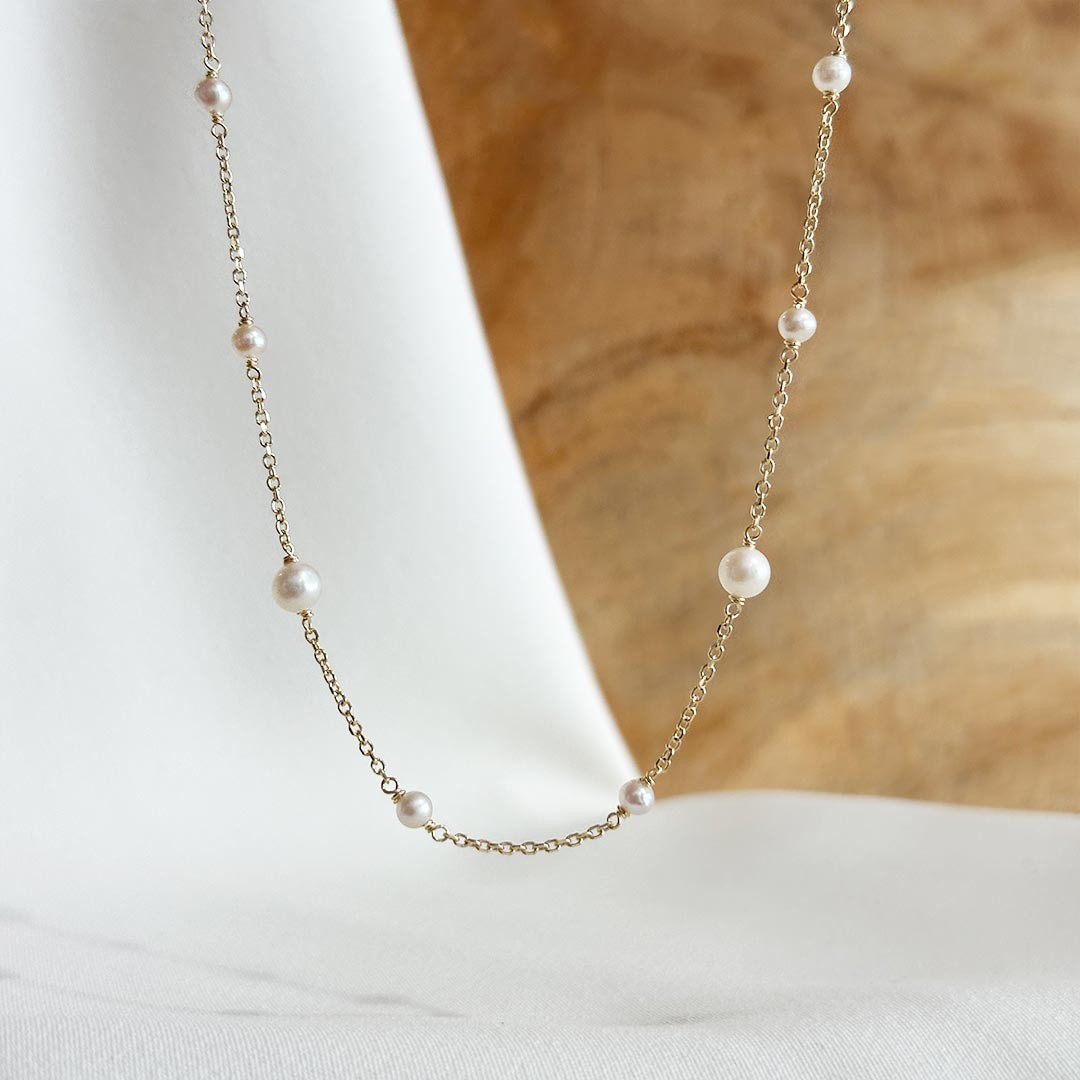 Diese zarte Goldkette aus 585er Gelbgold ist mit kleinen und etwas größeren weißen Süßwasserperlen versehen, die in regelmäßigen Abständen eingearbeitet sind. Durch das feine Spiel unterschiedlicher Größen entsteht eine lebendige, moderne Optik – elegant, aber nicht streng klassisch, sondern mit einem leichten, jugendlichen Charakter. Die Perlen verleihen der Kette eine lieblich-schöne Ausstrahlung, die sich wunderbar im Alltag tragen lässt. Mit einer Länge von 45cm und einer Zwischenöse bei 42cm kann sie individuell angepasst werden. Ein feines Schmuckstück für alle, die ihren Einstieg in die Welt der Perlen und des Goldschmucks suchen – stilvoll, leicht und zeitlos schön.