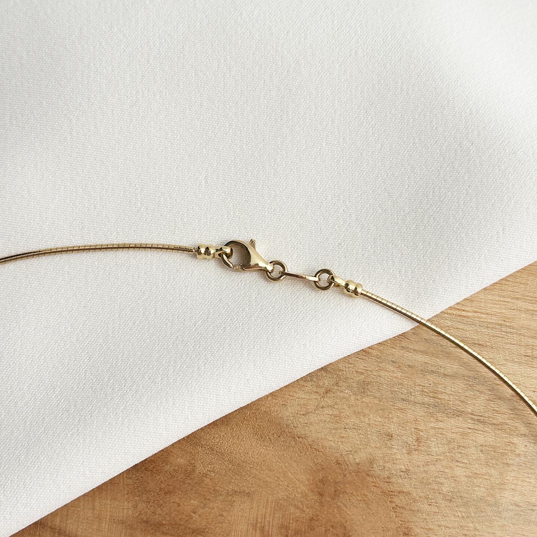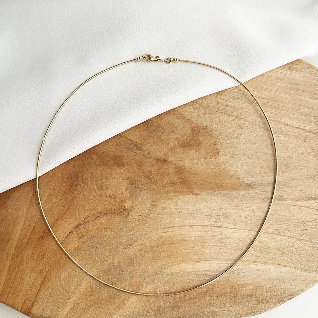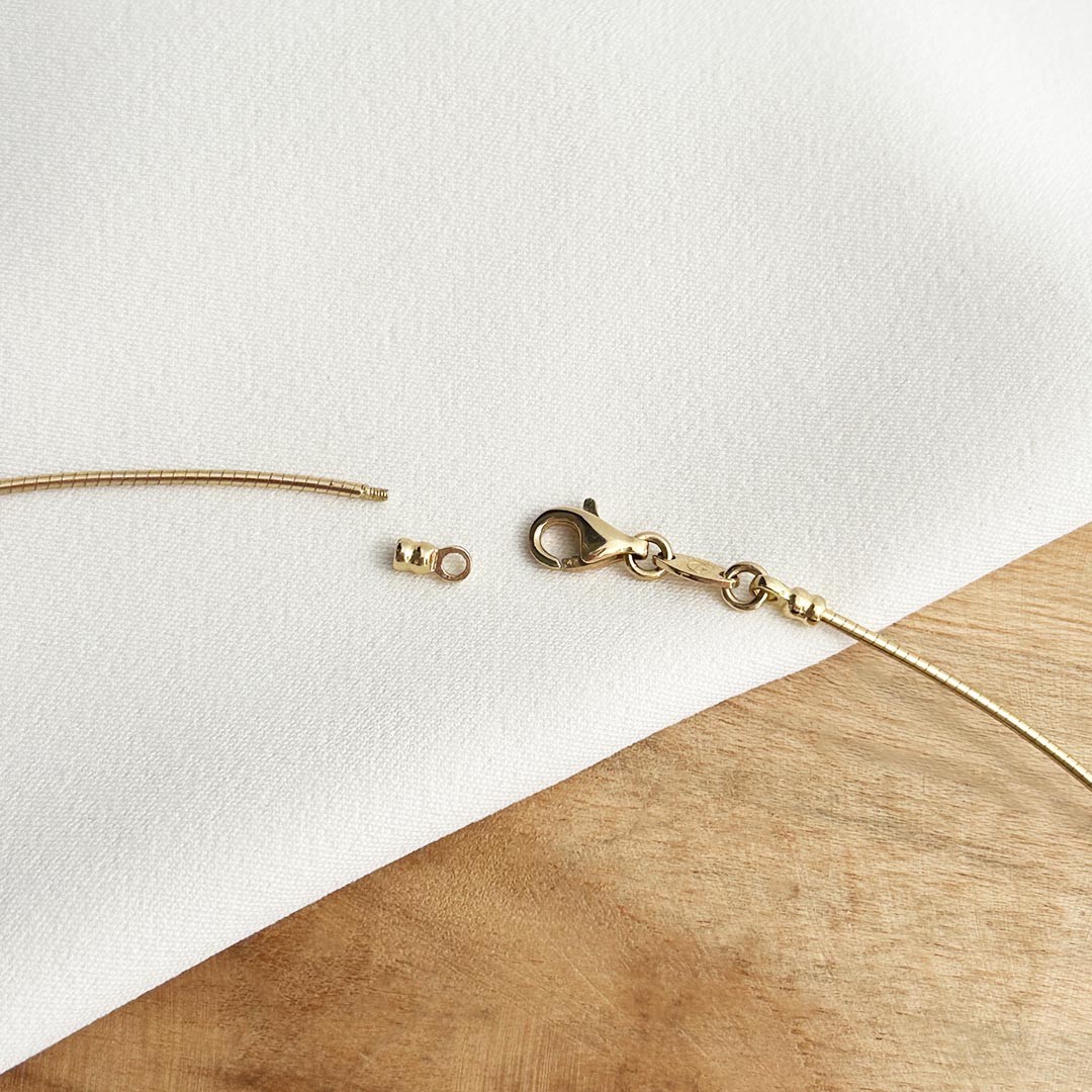 Dieser 45cm lange Halsreif aus 585er Gelbgold mit einer feinen Drahtstärke von 1mm überzeugt durch seine besondere Flexibilität und Trageeigenschaft. Im Gegensatz zu klassischen, steiferen Reifen schmiegt sich dieser Reif sanft an die individuelle Halsform an und bietet dadurch einen besonders angenehmen Sitz. Das Highlight ist jedoch der praktische Karabinerverschluss mit einem abschraubbaren Endstück: So lassen sich selbst Anhänger mit sehr kleinen Ösen problemlos anbringen – eine raffinierte Lösung, die das Tragen unterschiedlichster Schmuckstücke ermöglicht. Ist der Verschluss einmal sicher angebracht, kann er sich nicht mehr unbeabsichtigt öffnen. So bleibt der Reif zuverlässig geschlossen. Ein vielseitiger Begleiter für alle, die gerne variieren und auch filigrane Anhänger stilvoll in Szene setzen möchten.