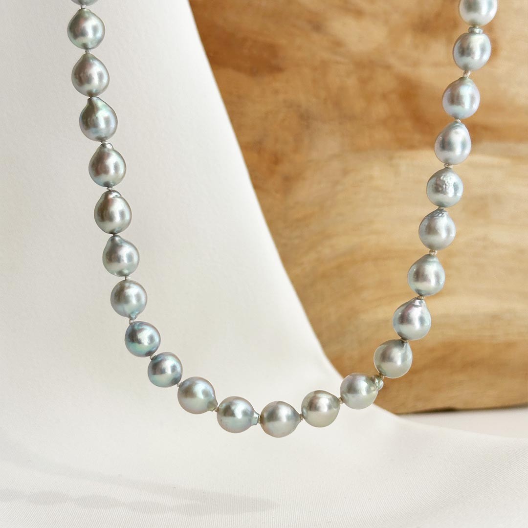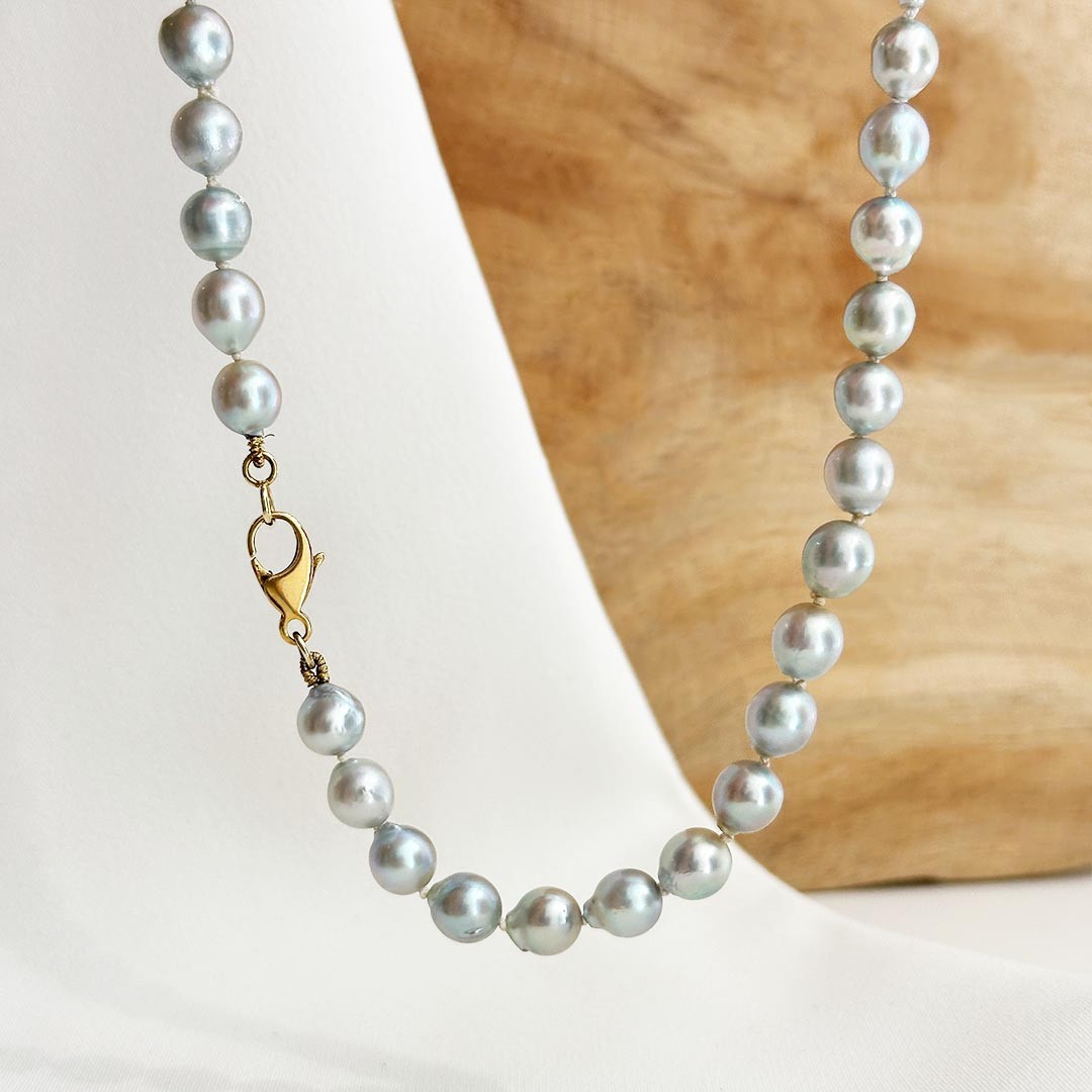 Diese Perlenkette aus fein schimmernden grauen Akoya-Perlen verbindet schlichte Eleganz mit modernem Stil. Mit einer Länge von 45cm und einer Perlengröße von 6,5–7mm eignet sie sich für alle, die zeitlosen Schmuck mit besonderem Ausdruck schätzen. Der Karabiner aus 585er Gelbgold sorgt für sicheren Halt und unterstreicht die hochwertige Verarbeitung. Die graue Farbgebung verleiht der Kette eine markante, edle Note – ein Ton, der sowohl bei Damen als auch bei Herren besonders beliebt ist. Ein modernes Schmuckstück, das durch seine natürliche Ausstrahlung überzeugt und sich vielseitig kombinieren lässt.