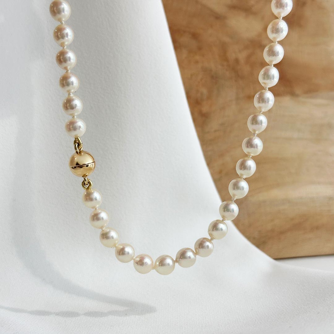 Diese 45cm lange Akoya-Perlenkette überzeugt durch ihre klassische Ausstrahlung und feine Zurückhaltung. Die Perlen mit einem Durchmesser von 6 bis 6,5mm zeigen ein zartes, natürliches Lüster und reihen sich harmonisch aneinander. Abgerundet wird das Design durch eine polierte 585 Gelbgold Magnetschließe in 8mm, die sich dezent einfügt und zugleich praktischen Komfort bietet. Die Kette schmeichelt durch ihre schlichte Eleganz und lässt sich mühelos sowohl im Alltag als auch zu festlichen Anlässen tragen. Ein zeitloses Schmuckstück, das durch seine unaufdringliche Präsenz besticht und der Trägerin eine stilvolle Note verleiht.