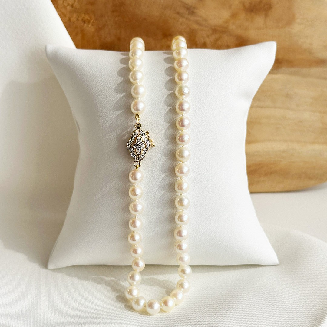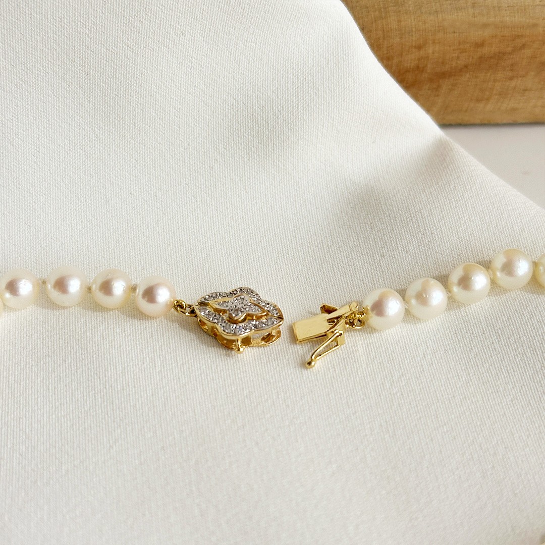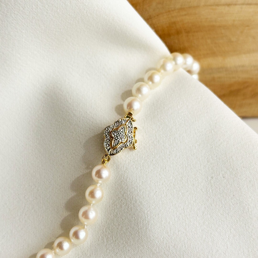 Diese Akoya-Perlenkette mit einer Länge von 46cm wirkt durch ihre zarten Perlen von 5,5 bis 6mm besonders fein und ausgewogen. Die kleinere Perlengröße verleiht dem Collier eine leichte, elegante Ausstrahlung und macht es zu einem vielseitigen Begleiter für viele Gelegenheiten. Ein besonderes Detail ist die dekorative Schließe aus 585er Gelbgold, die mit kleinen Diamanten besetzt ist und dem Schmuckstück einen dezenten, charmanten Akzent verleiht. Sie trägt einen Hauch von Vintage in sich und bleibt dabei dennoch klassisch und zeitlos. Die Schließe kann bewusst sichtbar getragen oder dezent im Nacken geschlossen werden. In Kombination mit klassischen Perlenohrsteckern oder schlichten Goldohrringen entsteht ein harmonisches Gesamtbild. Eine Perlenkette, die im Alltag ebenso überzeugt wie zu besonderen Anlässen.