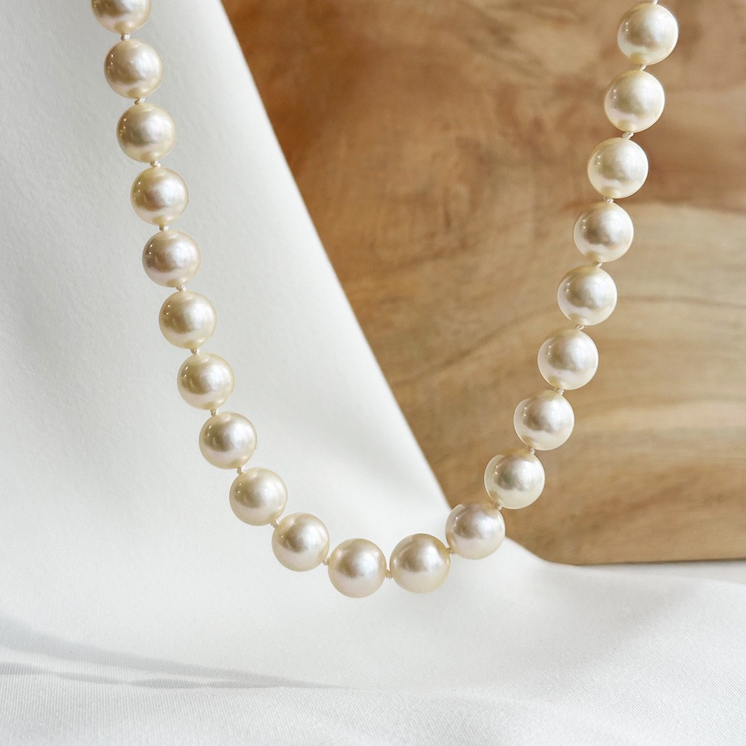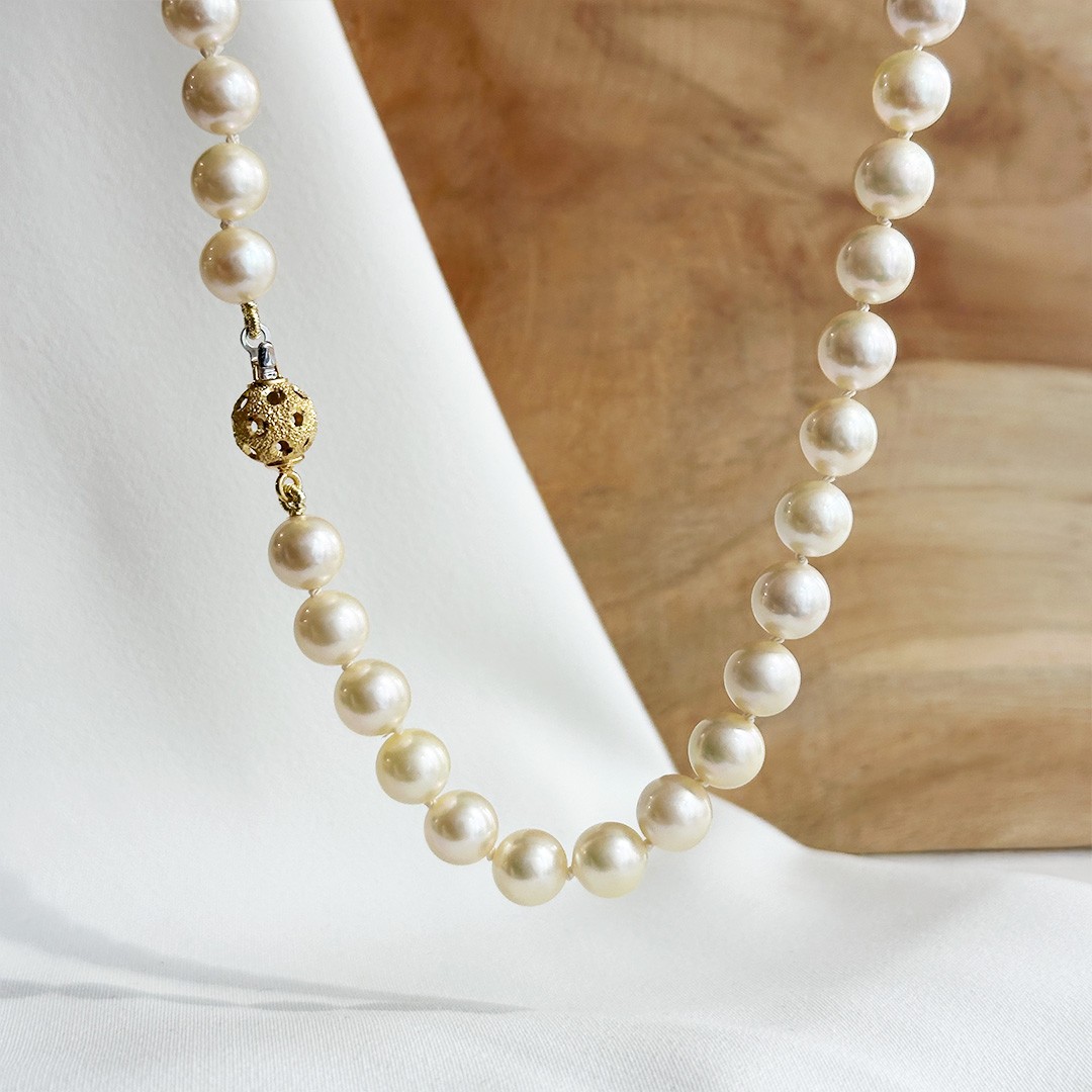 Diese Perlenkette mit einer Länge von 46cm wirkt durch ihre ausgewogene Proportion besonders harmonisch. Die Perlen mit einem Durchmesser von 7,5 bis 8mm zeichnen sich durch einen schönen Lüster aus und verleihen dem Collier eine elegante, zugleich sehr angenehme Ausstrahlung. Ein besonderes Detail ist die raffiniert gestaltete Schließe aus 585er Gelbgold, die sich stilvoll in das Design einfügt und dem Schmuckstück einen zusätzlichen feinen Akzent verleiht. Sie kann dezent im Nacken getragen oder bewusst seitlich in Szene gesetzt werden. Die Kette lässt sich vielseitig kombinieren, etwa mit schlichten Perlenohrsteckern für einen klassischen Auftritt oder mit Goldschmuck für eine etwas ausdrucksstärkere Note. Ein zeitloses Collier, das sowohl im Alltag als auch zu besonderen Anlässen Freude bereitet.
