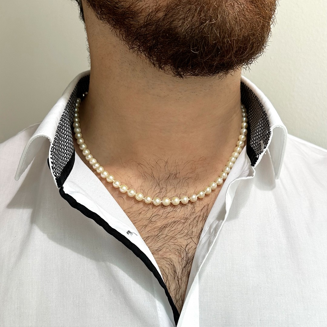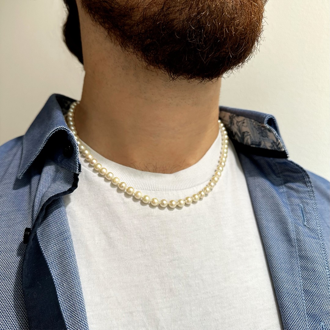 Diese Akoya-Perlenkette aus fein abgestimmten Kulturperlen besticht durch ihre natürliche Eleganz und ihren modernen Charakter. Mit einer Länge von 48cm und einer Perlengröße von 5,5mm eignet sie sich für alle, die zartere Perlen bevorzugen und ein dezentes Schmuckstück mit Stil suchen. Geschlossen wird die Kette mit einem polierten Springring aus 925er Silber, der eine sichere und einfache Handhabung gewährleistet. Durch ihre Länge kann sie sowohl von Damen als auch von Herren getragen werden – ein vielseitiges Schmuckstück für alle, die die schlichte Schönheit von Perlen schätzen.