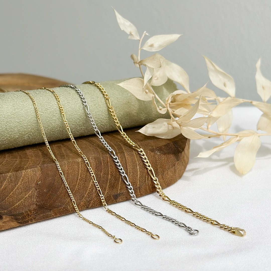 Figaro Goldkette aus 585 Gelbgold mit einer Länge von 50cm und 1,8mm Stärke. Diese Kettenart kann von Damen und Herren gleichermaßen getragen werden. Die Figarokette ist eine besondere Art von Panzerkette mit einer speziellen Anordnung der Glieder. Ihre Glieder wechseln zwischen fünf runden und einem ovalen Kettenglied. Dadurch entsteht das klassische Design der Figarokette, die auch gerne ohne Anhänger getragen wird. Falls Ihre gewünschte Länge gerade nicht vorrätig ist, benötigt die Bestellung nur 2-4 Werktage. Tipp zur Kettenlänge: Als Orientierung gelten folgende Standardlängen – für Damen meist 42–45cm, für Herren 50–60cm und für Kinder etwa 36–40cm.