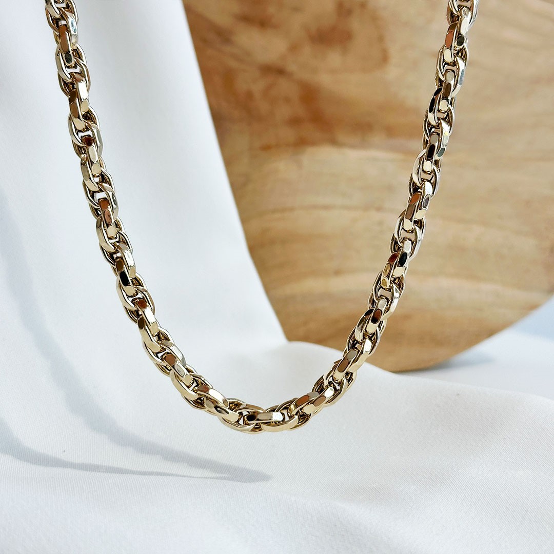 Diese elegante Goldkette aus 585er Gelbgold besticht durch ihr gekordeltes Design mit leicht abgeschrägten Gliedern. Durch diese besondere Verarbeitung reflektieren die einzelnen Flächen das Licht auf faszinierende Weise und sorgen für ein Funkeln. Mit einer Länge von 50cm und einer Breite von 5,8mm ist sie ein stilvolles Schmuckstück, das sowohl für den Alltag als auch für besondere Anlässe geeignet ist. Die Kette ist leicht gefertigt, sodass sie angenehm zu tragen ist, ohne Ausdruck und Präsenz zu verlieren. Ihr harmonisches Design verleiht eine edle Note und macht sie zu einem vielseitigen Begleiter, der solo ebenso wie in Kombination mit weiteren Schmuckstücken überzeugt.
