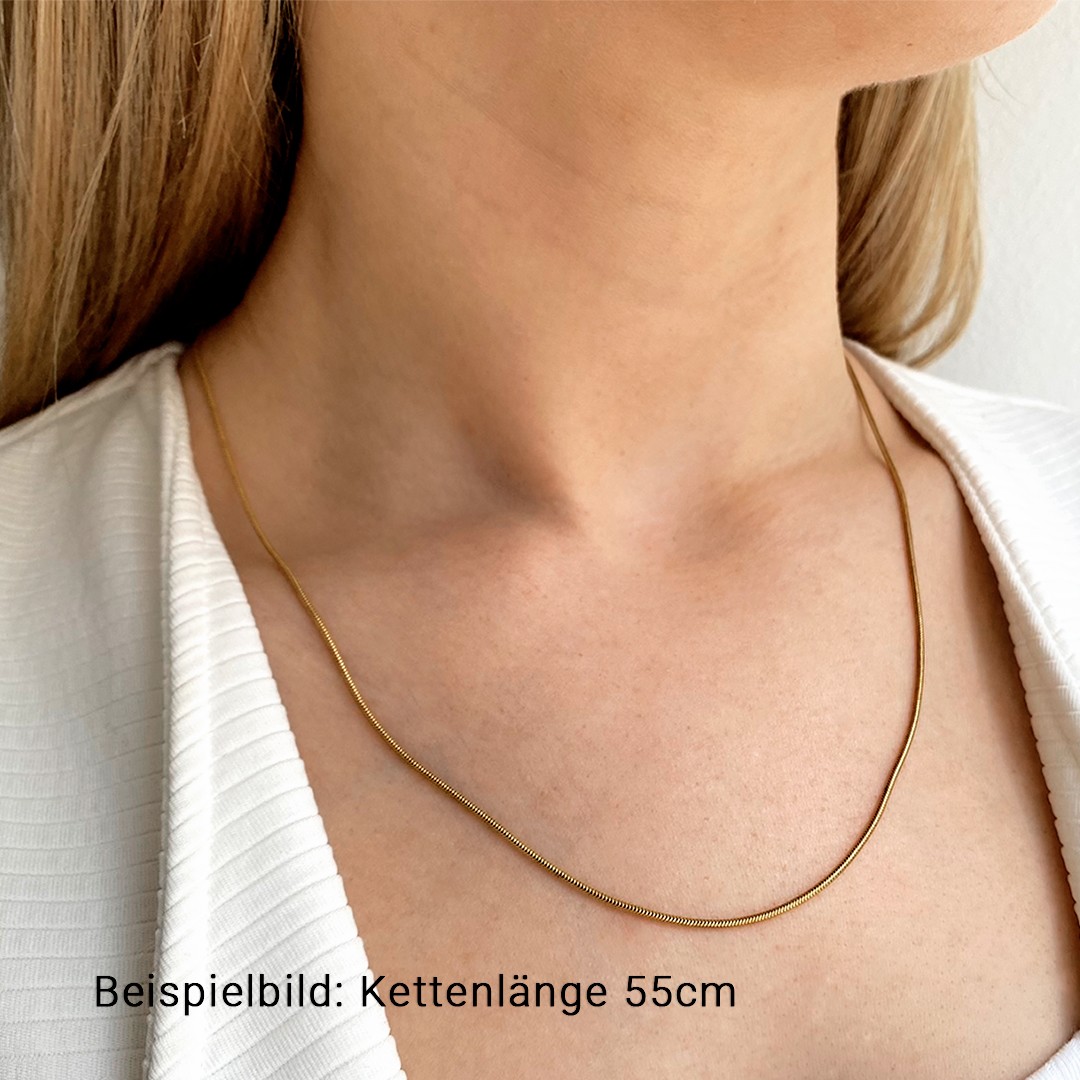 Schlangen Goldkette aus 585 Gelbgold mit einer Länge von 55cm und 1,2mm Stärke. Die Kettenglieder sind eng miteinander verbunden und haben eine schmeichelnde, fließende Form, die an die Bewegungen einer Schlange erinnert. Der Glanz des Goldes verstärkt die Eleganz der Schlagenkette. Unsere Standard-Goldketten sind in 585 oder 750 Gelb- und Weißgold in verschiedenen Längen und Stärken erhältlich. Tipp zur Kettenlänge: Als Orientierung gelten folgende Standardlängen – für Damen meist 42–45cm, für Herren 50–60cm und für Kinder etwa 36–40cm.